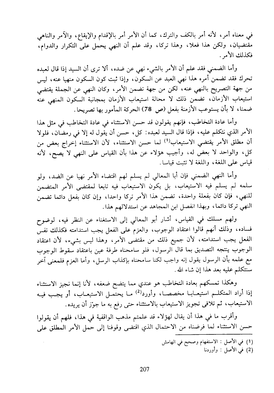 وأما النهي الضمني فإن أبا المعالي لم يسلم لهم اقتضاء الأمر نهيا عن الضد، ولو سلمه لم يسلم فيه الاستيعاب، بل يكون الاستيعاب فيه تابعا لمقتضى الأمر المتضمن للنهي، فإن كان بفعله واحدة، تضمن هذا الأمر تركا واحدا، وإن كان بفعل دائما تضمن النهي تركا دائما، وبهذا انفصل ابن المجاهد عن استدلالهم هذا.