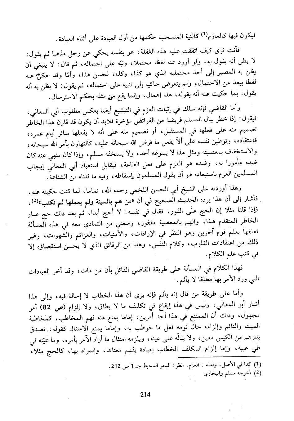 وأما القاضي فإنه سلك في إثبات العزم في التبشيع أيضا بعكس مطلوب أبي المعالي، فيقول: إذا خطر ببال المسلم فريضة من الفرائض مؤخرة فلابد أن يكون قد قارن هذا الخاطر تصميم منه على فعلها في المستقبل، أو تصميم منه على أنه لا يفعلها سائر أيام عمره، فاعتقاده، وتوطين نفسه على ألا يفعل ما فرض الله سبحانه عليه، كالتهاون بأمر الله سبحانه، والاستخفاف بمعصيته ومثل هذا لا يسوغه أحد، ولا يستخفه مسلم، وإذا كان منهي عنه كان ضده مأمورا به، وضده هو العزم على فعل الطاعة، فيقابل استعباد أبي المعالي إيجاب المسلمين العزم باستبعاده هو أن يقول المسلمون بإسقاطه، وفيه ما قلناه من الشناعة.