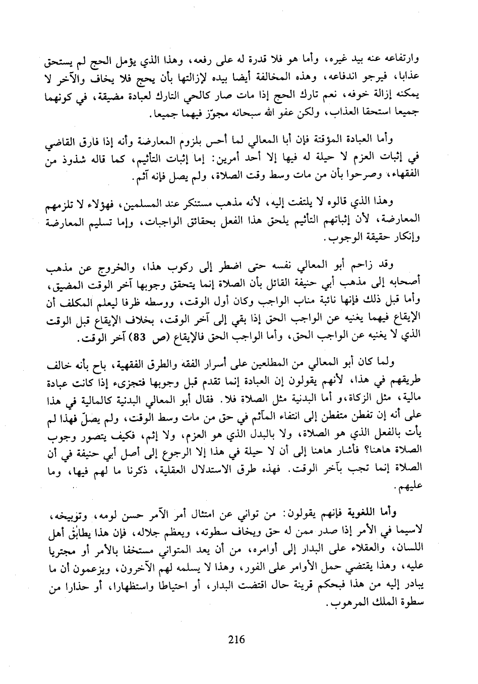 وقد زاحم أبو المعالي نفسه حتى اضطر إلى ركوب هذا، والخروج عن مذهب أصحابه إلى مذهب أبي حنيفة القائل بأن الصلاة إنما يتحقق وجوبها آخر الوقت المضيق، وأما قبل ذلك فإنها نائبة مناب الواجب وكان أول الوقت، ووسطه ظرفا ليعلم المكلف أن الإيقاع فيهما يغنيه عن الواجب الحق، وأما الواجب الحق فالإيقاع (ص ٨٣) آخر الوقت.