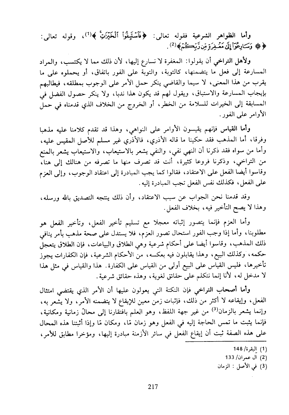 وأما الظواهر الشرعية فقوله تعالى: (فاستبقوا الخيرات)، وقوله تعالى: (وسارعوا إلى مغفرة من ربكم).