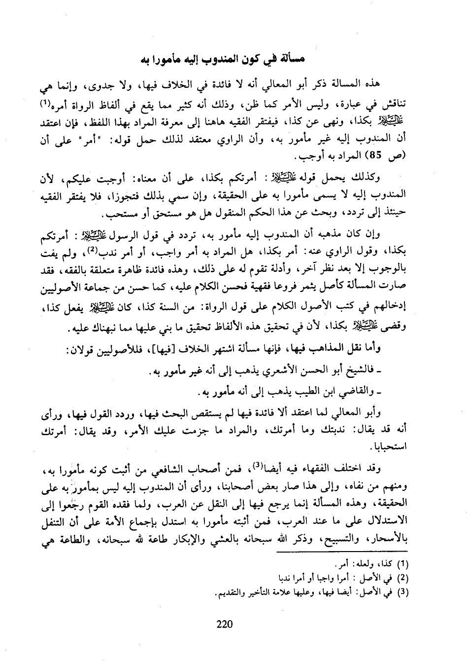 وقد اختلف الفقهاء فيه أيضا، فمن أصحاب الشافعي من أثبت كونه مأمورا به، ومنهم من نفاه، وإلى هذا صار بعض أصحابنا، ورأى أن المندوب إليه ليس بمأمور به على الحقيقة، وهذه المسألة إنما يرجع فيها إلى النقل عن العرب، ولما فقده القوم رجعوا إلى الاستدلال على ما عند العرب، فمن أثبته مأمورا به استدل بإجماع الأمة على أن التنفل بالأسحار، والتسبيح، وذكر الله سبحانه بالعشي والإبكار طاعة لله سبحانه، والطاعة هي