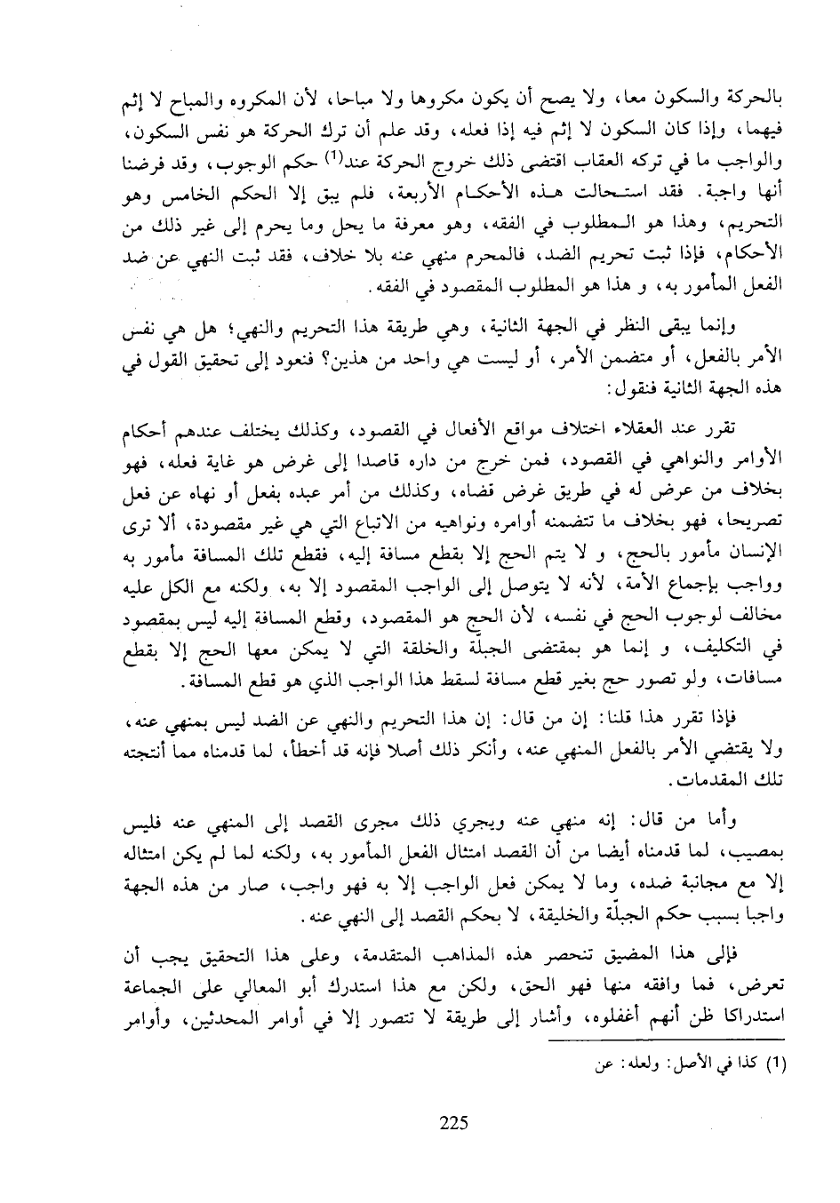 بالحركة والسكون معا، ولا يصح أن يكون مكروها ولا مباحا، لأن المكروه والمباح لا إثم فيهما، وإذا كان السكون لا إثم فيه إذا فعله، وقد علم أن ترك الحركة هو نس السكون، والواجب ما في تركه العقاب اقتضى ذلك خروج الحركة عند حكم الوجوب، وقد فرضنا أنها واجبة. فقد استحالت هذه الأحكام الأربعة، فلم يبق إلا الحكم الخامس وهو التحريم، وهذا هو المطلوب في الفقه، وهو معرفة ما يحل وما يحرم إلى غير ذلك من الأحكام، فإذا ثبت تحريم الضد، فالمحرم منهي عنه بلا خوف، فقد ثبت النهي عن ضد الفعل المأمور به، وهذا هو المطلوب المقصود في الفقه.
