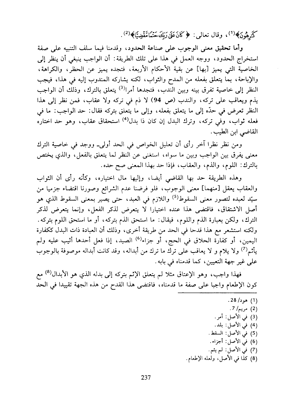 ومن نظر نظرا آخر رأى أن تعليل الخواص في الحد أولى ـ ووجد في خاصية الترك معنى يفرق بين الواجب وبين ما سواه، استغنى عن النظر لما يتعلق بالفعل، والذي يختص بالترك: اللوم، والذم، والعقاب، فإذا حد بهذا المعنى صح حده.