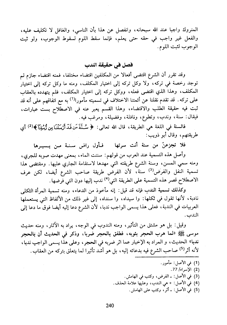 وقد تقرر أن الشرع اقتضى أفعالا من المكلفين اقتضاء مختلفا، فمنه اقتضاء جازم لم توجد رخصة في تركه، ولا وكل تركه إلى اختيار المكلف، ومنه ما وكل تركه إلى اختيار المكلف، وهذا الذي اقتضى فعله، ووكل تركه إلى اختيار المكلف، فلم يتهدده بالعقاب على تركه. قد تقدم نقلنا عن أئمتنا الاختلاف في تسميته مأمورا به مع اتفاقهم على أنه قد ثبت فيه حقيقة الطلب والاقتضاء، وهذا القسم يعبر عنه في الاصطلاح بست عبارات، فيقال: سنة، وندب، وتطوع، ونافلة، وفضيلة، ومرغب فيه.