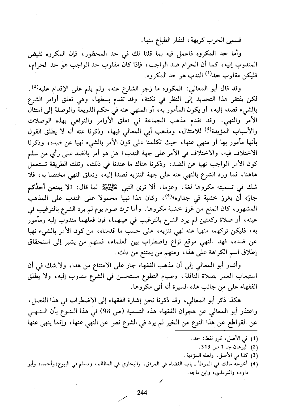 هكذا ذكر أبو المعالي، وقد ذكرنا نحن إشارة الفقهاء إلى الاضطراب في هذا الفصل، واعتذر أبو المعالي عن هجران الفقهاء هذه التسمية (ص ٩٨) في هذا النوع بأن النهي عن القواطع عن هذا النوع من الخير لم يرد في الشرع نص عن النهي عنها، وإنما ينهى عنها