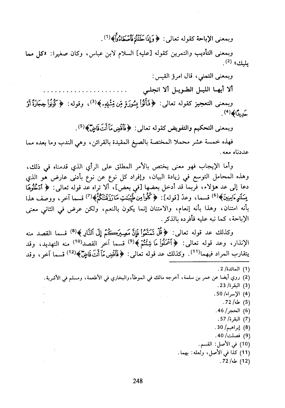 وأما الإيجاب فهو معنى يختص بالأمر المطلق على الرأي الذي قدمناه في ذلك، وهذه المحامل التوسع في زيادة البيان، وإفراد كل نوع عن نوع بأدنى عارض هو الذي دعا إلى عد هؤلاء، فربما قد أدخل بعضها [في بعض]، ألا تراه عد قوله تعالى: ادخلوها بسلام أمنين) قسما، وعد [قوله]: (كلوا من طيبات ما رزقناكم) قسما آخر، ووصف هذا بأنه امتنان، وهذا بأنه إنعام، والامتنان إنما يكون بالنعم، ولكن عرض في الثاني معنى الإباحة، كما نبه عليه فأفرده بالذكر.