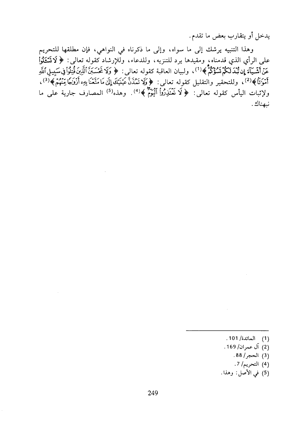 وهذا التنبيه يرشدك إلى ما سواه، وإلى ما ذكرناه في النواهي، إن مطلقها للتحريم على الرأي الذي قدمناه، ومقيدها يرد للتنزيه، وللدعاء، وللإرشاد كقوله تعالى: (لا تسألوا عن أشياء إن تبد لكم تسؤكم)، ولبيان العقابة كقوله تعالى: (ولا تحسبن الذين قتلوا في سبيل الله أمواتا)، وللتحقير والتقليل كقوله تعالى: (ولا تمدن عينيك إلى ما متعنا به أزواجًا منهم)، ولإثبات اليأس كقوله تعالى: (لا تعتذروا اليوم). وهذه المصارف جارية على ما نبهناك.