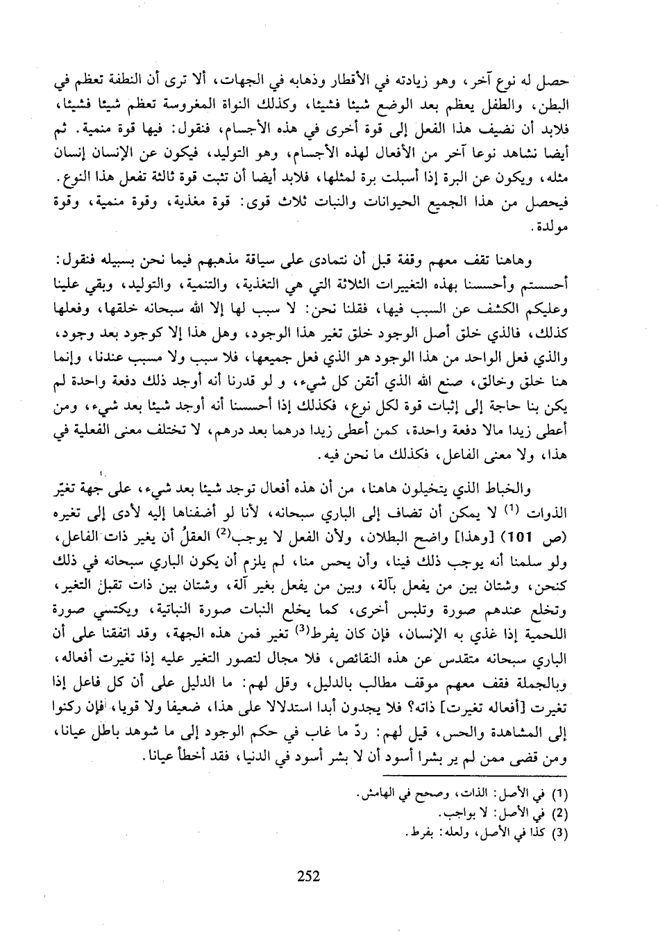 والخباط الذي يتخيلون هاهنا، من أن هذه أفعال توجد شيئا بعد شيء، على جهة تغير الذوات لا يمكن أن تضاف إلى الباري سبحانه، لأنا لو أضفناها إليه لأدى إلى تغيره (ص ١٠١) [وهذا] واضح البطلان، ولأن الفعل لا يوجب العقل أن يغير ذات الفاعل، ولو سلمنا أنه يوجب ذلك فينا، وأن يحس منا، لم يلزم أن يكون الباري سبحانه في ذلك كنحن، وشتان بين من يفعل بآلة، وبين من يفعل بغير آلة، وشتان بين ذات تقبل التغير، وتخلع عندهم صورة وتلبس أخرى، كما يخلع النبات صورة النباتية، ويكتسي صورة اللحمية إذا غذي به الإنسان، فإن كان يفرط تغير فمن هذه الجهة، وقد اتفقنا على أن الباري سبحانه متقدس عن هذه النقائص، فلا مجال لتصور التغير عليه إذا تغيرت أفعاله، وبالجملة فقف معهم موقف مطالب بالدليل، وقل لهم: ما الدليل على أن كل فاعل إذا تغيرت [أفعاله تغيرت] ذاته؟ فلا يجدون أبدا استدلالا على هذا، ضعيفا ولا قويا، فإن ركنوا إلى المشاهدة والحس، قيل لهم: رد ما غاب في حكم الوجود إلى ما شوهد باطل عيانا، ومن قضى ممن لم ير بشرا أسود أن لا بشر أسود في الدنيا، فقد أخطأ عيانا.