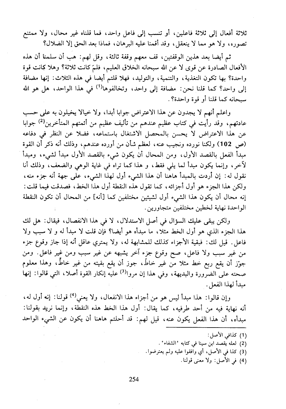 واعلم أنهم لا يجدون عن هذا الاعتراض جوابا أبدا، ولا خيالا يخيلون به على حسب عادتهم، وقد رأيت في كتاب عظيم عندهم من تأليف عظيم من أئمتهم المتأخرين جوابا عن هذا الاعتراض لا يحسن بالمحصل الاشتغال باستماعه، فضلا عن النظر في دفاعه (ص ١٠٢) ولكنا نورده ونجيب عنه، لعظم شأن من أورده عندهم، وذلك أنه ذكر أن القوة مبدأ الفعل بالقصد الأول، ومن المحال أن يكون شيء بالقصد الأول مبدأ لشيء، ومبدأ لآخر، وإنما يكون مبدأ لما يلي فقط، وهذا كما تراه في غاية الوهي والضعف، وذلك أنا نقول له: إن أردت بالمبدأ هاهنا أن هذا الشيء أول لهذا الشيء، على جهة أنه جزء منه، ولكن هذا الجزء هو أول أجزائه، كما تقول هذه النقطة أول هذا الخط، فصدقت فيما قلت: إنه محال أن يكون هذا الشيء أول لشيئين مختلفين كما [أنه] من المحال أن تكون النقطة الواحدة نهاية لخطين مختلفين متجاورين.