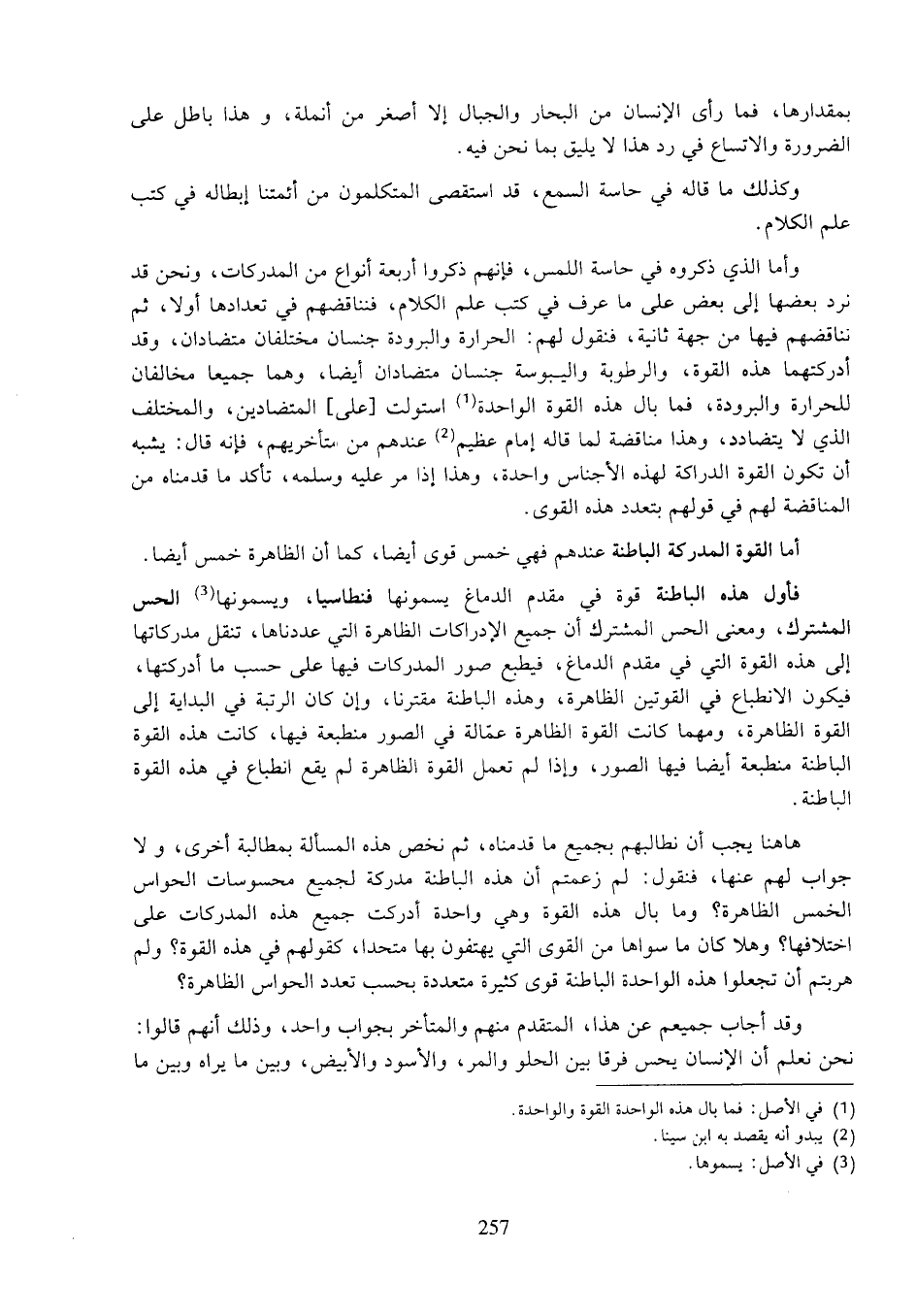 هاهنا يجب أن نطالبهم بجميع ما قدمناه، ثم نخص هذه المسألة بمطالبة أخرى، ولا جواب لهم عنها، فنقول: لم زعمتم أن هذه الباطنة مدركة لجميع محسوسات الحواس الخمس الظاهرة؟ وما بال هذه القوة وهي واحدة أدركت جميع هذه المدركات على اختلافها، وهلا كان ما سواها من القوى التي يهتفون بها متحدا، كقولهم في هذه القوة؟ ولم هربتم أن تجعلوا هذه الواحدة الباطنة قوى كثيرة متعددة بحسب تعدد الحواس الظاهرة؟