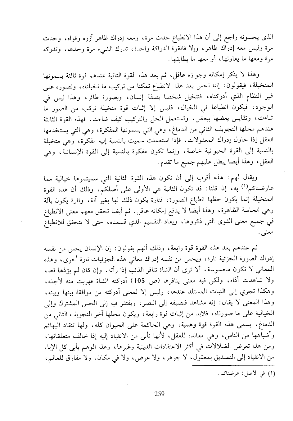 ويقال لهم: هذه أقرب إلى أن تكون هذه القوة الثانية التي سميتوها خيالية مما عارضناكم به، إذا قلنا: قد تكون الثانية هي الأولى على أصلكم، وذلك أن هذه القوة المتخيلة إنما يكون حظها انطباع الصورة، فتارة يكون ذلك لها بغير آلة، وتارة يكون بآلة وهي الحاسة الظاهرة، وهذا أيضا لا يدفع إمكانه عاقل. ثم أيضا تحقق معهم معنى الانطباع في جميع معنى القوى التي ذكروها، ويعاد التقسيم الذي قسمناه، حتى لا يتحقق للانطباع معنى.