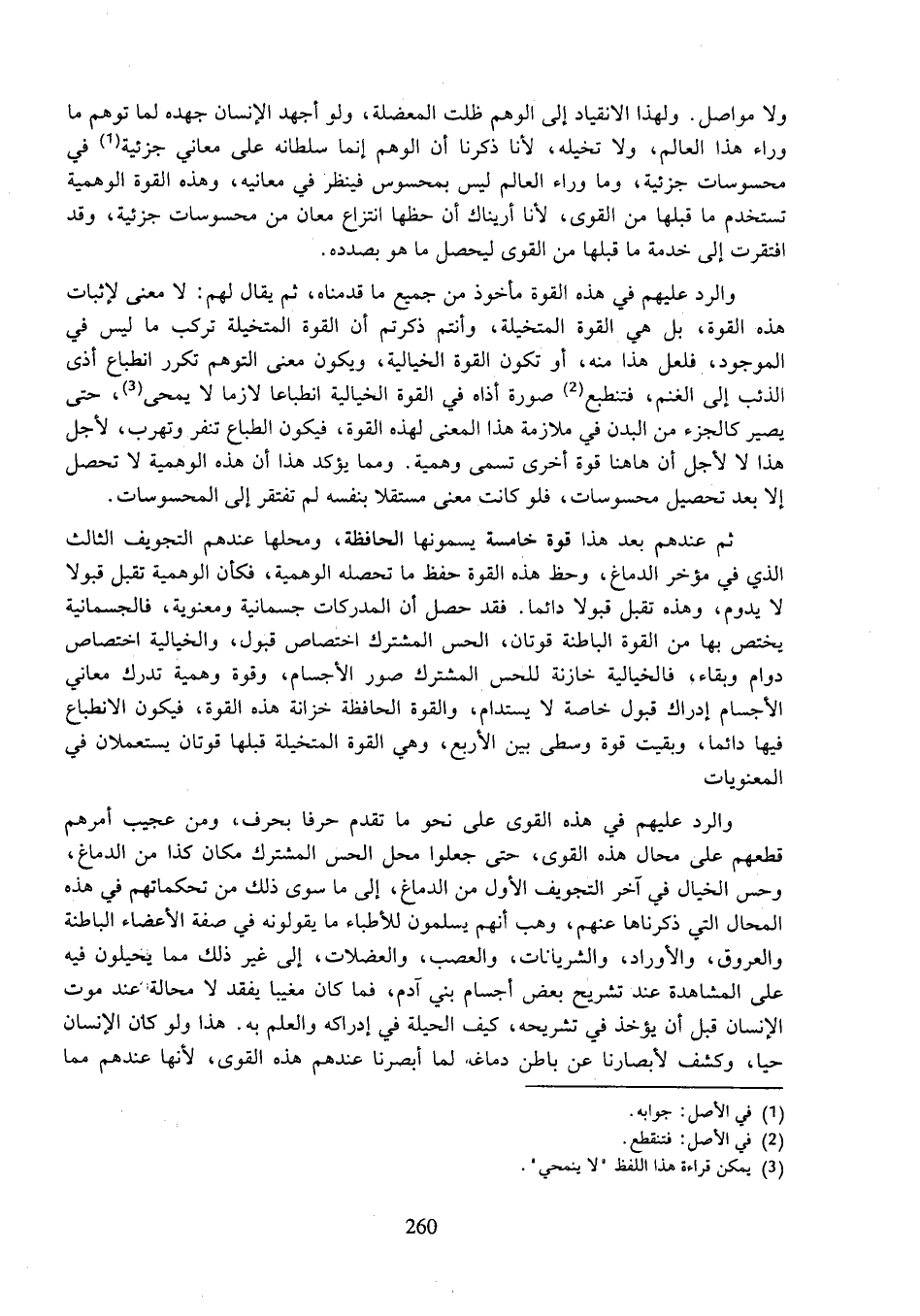 والرد عليهم في هذه القوى على نحو ما تقدم حرفا بحرف، ومن عجيب أمرهم قطعهم على محال هذه القوى، حتى جعلوا محل الحس المشترك مكان كذا من الدماغ، وحس الخيال في آخر التجويف الأول من الدماغ، إلى ما سوى ذلك من تحكماتهم في هذه المحال التي ذكرناها عنهم، وهب أنهم يسلمون للأطباء ما يقولونه في صفة الأعضاء الباطنة والعروق، والأوراد، والشريانات، والعصب، والعضلات، إلى غير ذلك مما يحيلون فيه على المشاهدة عند تشريح بعض أجسام بني آدم، فما كان مغيبا يفقد لا محالة عند موت الإنسان قبل أن يؤخذ في تشريحه، كيف الحيلة في إدراكه والعلم به. هذا ولو كان الإنسان حيا، وكشف لأبصارنا عن باطن دماغه لما أبصرنا عندهم هذه القوى، لأنها عندهم مما