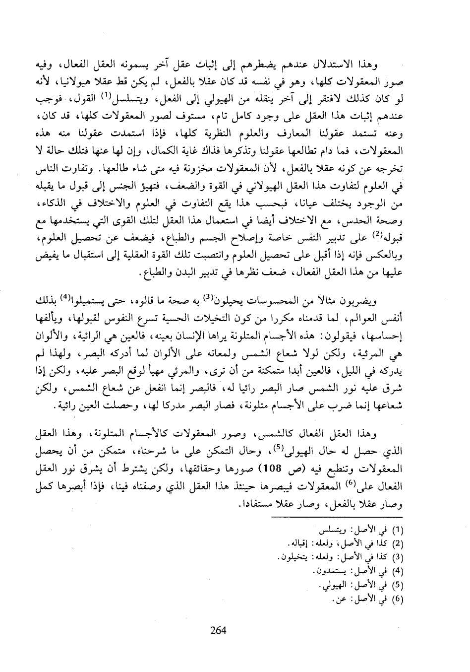 وهذا العقل الفعال كالشمس، وصور المعقولات كالأجسام المتلونة، وهذا العقل الذي حصل له حال الهيولي، وحال التمكن على ما شرحناه، متمكن من أن يحصل المعقولات وتنطبع فيه (ص ١٠٨) صورها وحقائقها، ولكن يشترط أن يشرق نور العقل الفعال على المعقولات فيبصرها حينئذ هذا العقل الذي وصفناه فينا، فإذا أبصرها كمل وصار عقلا بالفعل، وصار عقلا مستفادا.