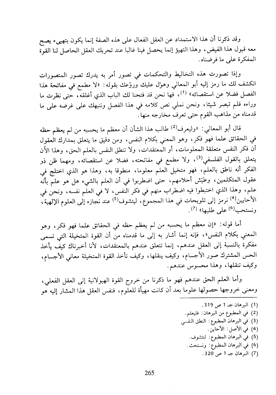 قال أبو المعالي: "وليعرف طالب هذا الشأن أن معظم ما يحسبه من لم يعظم حظه في الحقائق علما فهو فكر، وهو المعنى بكلام النفس، ومن دقيق ما يتعلق بمدارك العقول أن فكر النفس متعلقة المعلومات، أو المعتقدات، ولا تنطق النفس بالعلم الحق، وهذا الآن يتعلق بالقول الفلسفي، ولا مطمع في مفاتحته، فضلا عن استقصائه، ومهما ظن ذو الفكر أنه ناطق بالعلم، فهو متخيل العلم معلوما، ومنطوقا به، وهذا هو الذي اختلج في عقول المتكلمين، وطيش أحلامهم، حتى اضطربوا في أن العلم بالشيء هل هو علم بأنه علم، وهذا الذي اختبطوا فيه اضطراب منهم في فكر النفس، لا في العلم نفسه، ونحن في الأحايين نرمز إلى تلويحات في هذا المجموع، ليتشوف عند نجازه إلى العلوم الإلهية، ونستحب على طلبها".