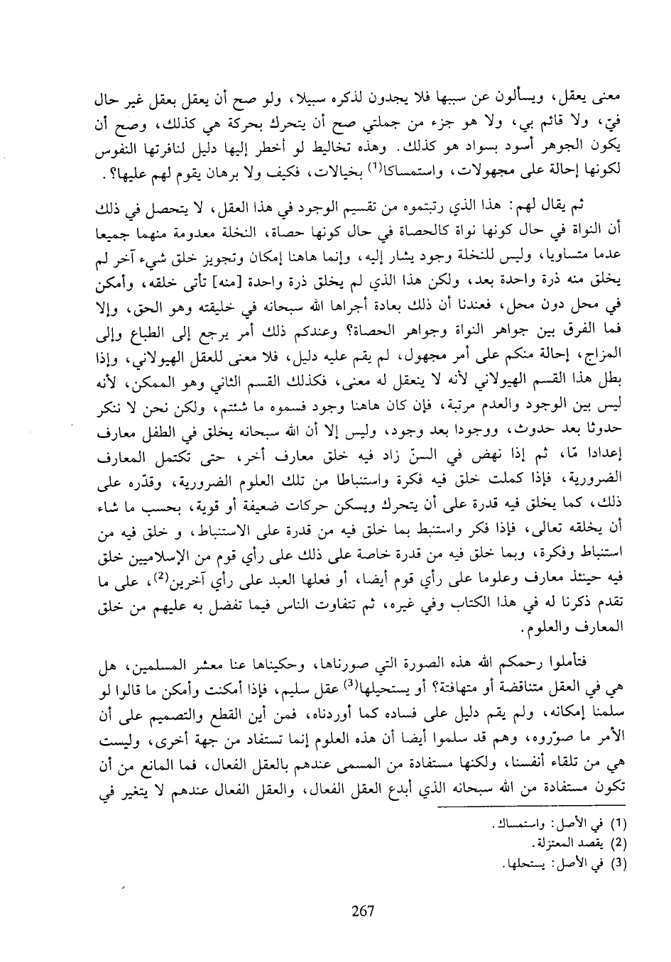ثم يقال لهم: هذا الذي رتبتموه من تقسيم الوجود في هذا العقل، لا يتحصل في ذلك أن النواة في حال كونها نواة كالحصاة في حال كونها حصاة، النخلة معدومة منهما جميعا عدما متساويا، وليس للنخلة وجود يشار إليه، وإنما هاهنا إمكان وتجويز خلق شيء آخر لم يخلق منه ذرة واحدة بعد، ولكن هذا الذي لم يخلق ذرة واحدة [منه] تأتي خلقه، وأمكن في محل دون محل، فعندنا أن ذلك بعادة أجراها الله سبحانه في خليقته وهو الحق، وإلا فما الفرق بين جواهر النواة وجواهر الحصاة؟ وعندكم ذلك أمر يرجع إلى الطباع وإلى المزاج، إحالة منكم على أمر مجهول، لم يقم عليه دليل، فلا معنى للعقل الهيولاني، وإذا بطل هذا القسم الهيولاني لأنه لا ينعقل له معنى، فكذلك القسم الثاني وهو الممكن، لأنه ليس بين الوجود والعدم مرتبة، فإن كان هاهنا وجود فسموه ما شئتم، ولكن نحن لا ننكر حدوثا بعد حدوث، ووجودا بعد وجود، وليس إلا أن الله سبحانه يخلق في الطفل معارف إعدادا ما، ثم إذا نهض في السن زاد فيه خلق معارض أخر، حتى تكتمل المعارف الضرورية، فإذا كملت خلق فيه فكرة واستنباطا من تلك العلوم الضرورية، وقدره على ذلك، كما يخلق فيه قدرة على أن يتحرك ويسكن حركات ضعيفة أو قوية، بحسب ما شاء أن يخلقه تعالى، فإذا فكر واستنبط بما خلق فيه من قدرة على الاستنباط، وخلق فيه من استنباط وفكرة، وبما خلق فيه من قدرة خاصة على ذلك على رأي قوم من الإسلاميين خلق فيه حينئذ معارف وعلوما على رأي قوم أيضا، أو فعلها العبد على رأي آخرين، على ما تقدم ذكرنا له في هذه الكتاب وفي غيره، ثم تتفاوت الناس فيما تفضل به عليهم من خلق المعارف والعلوم.