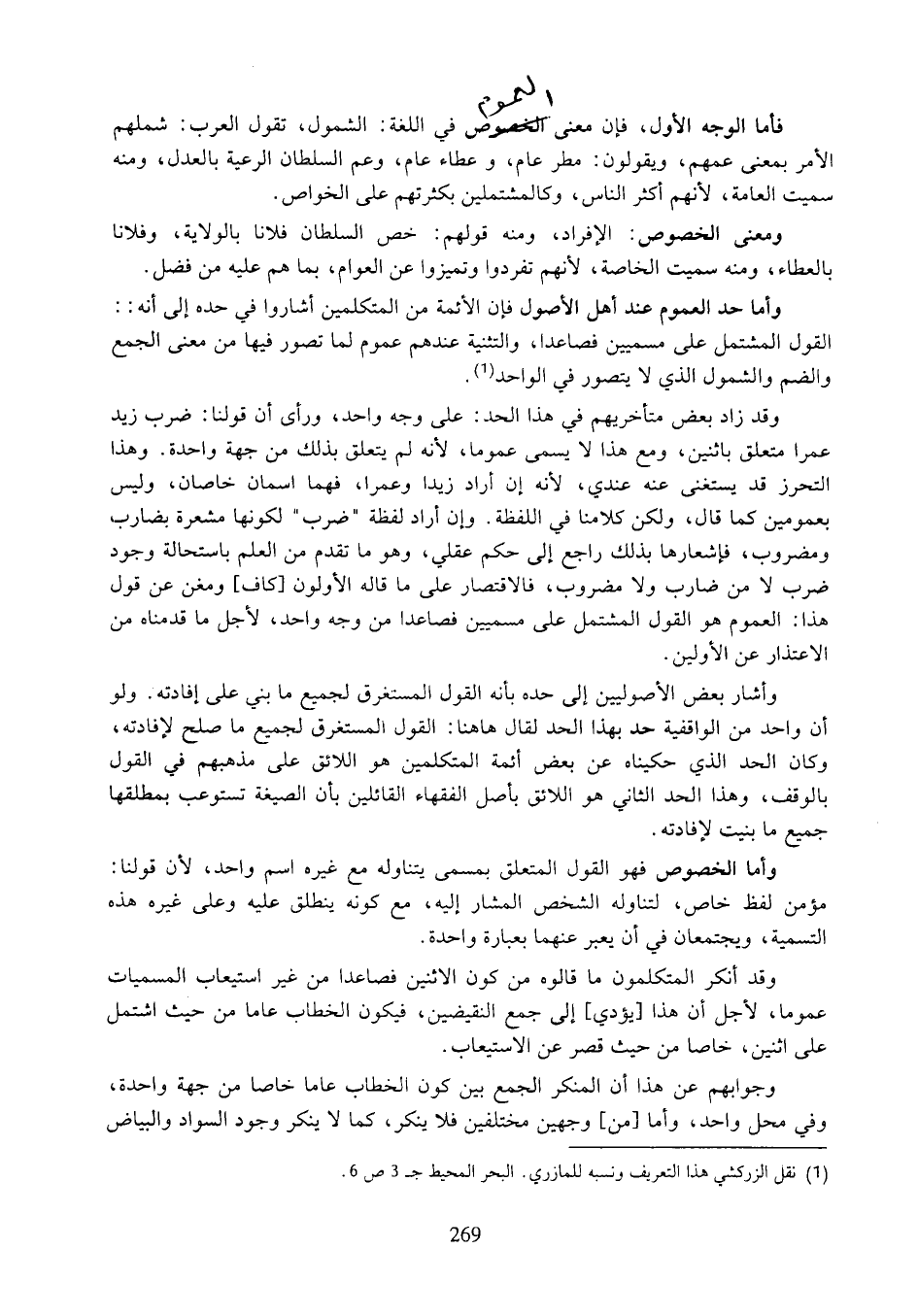 وأما الخصوص فهو القول المتعلق بمسمى يتناوله مع غيره اسم واحد، لأن قولنا: مؤمن لفظ خاص، لتناوله الشخص المشار إليه، مع كونه ينطلق عليه وعلى غيره هذه التسمية، ويجتمعان في أن يعبر عنهما بعبارة واحدة.