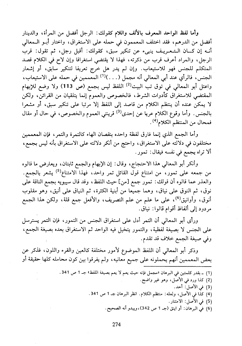 وأما لفظ الواحد المعرف بالألف واللام كقولك: الرجل أفضل من المرأة، والدينار أفضل من الدرهم، فقد اختلف المعممون في حمله على الاستغراق، واختار أبو المعالي أنه إن كان التعريف ينبئ عن تنكير سبق، كقولك: أقبل رجل، ثم تقول: قرب الرجل، والمراد أعرف قرب من ذكرته، فهذا لا يقتضي استغراقا وإن لاح في الكلام قصد المتكلم للجنس فهو للاستيعاب. وإن لم يدر هل خرج تعريفا لتنكير سابق، أو إشعار الجنس، فالرأي عند أبي المعالي أنه مجمل (...) المعممين في حمله على الاستيعاب، واعتل أبو المعالي في توق تب البيت اللفظ ليس بجمع (ص ١١٣) ولا وضع للإبهام المقتضي للاستغراق كأدوات الشرط، فالخصوص والعموم إنما يتلقيان من القرائن، ولكن لا يمكن عنده أن ينتظم الكلام من قاصد من اللفظ إلا مرتبا على تنكير سبق، أو مشعرا بالجنس، وأما وقوع الكلام عريا عن إحدى قرينتي العموم والخصوص، في حال أو مقال فمحال من المنتظم الكلام.