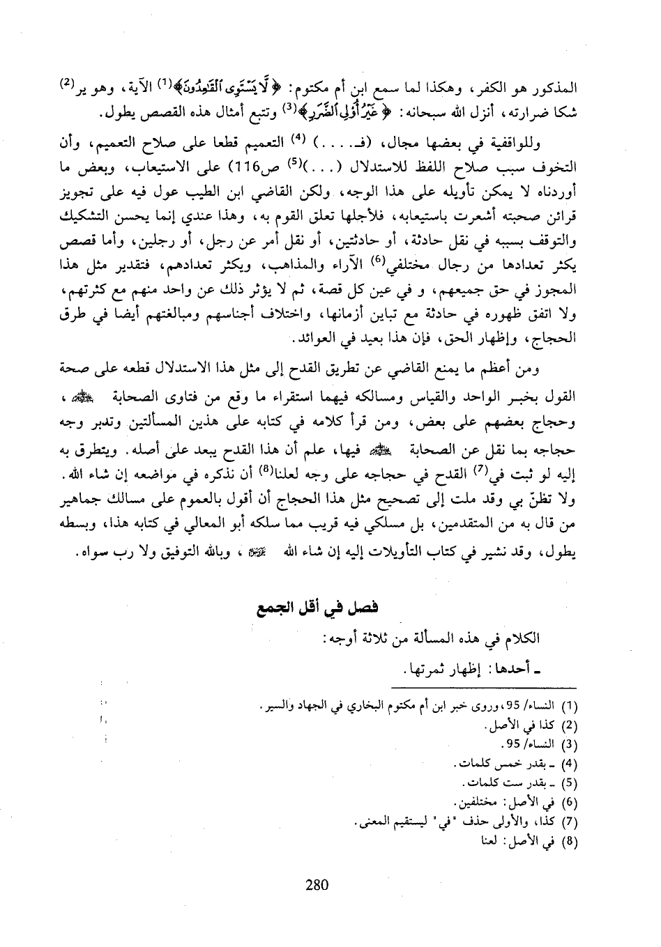 وللواقفية في بعضها مجال، (فـ ....) التعميم قطعا على صلاح التعميم، وأن التخوف سبب صلاح اللفظ للاستدلال (...) (ص ١١٦) على الاستيعاب، وبعض ما أوردناه لا يمكن تأويله على هذا الوجه، ولكن القاضي ابن الطيب عول فيه على تجويز قرائن صحبته أشعرت باستيعابه، فلأجلها تعلق القوم به، وهذا عندي إنما يحسن التشكيك والتوقف بسببه في نقل حادثة، أو حادثتين، أو نقل أمر عن رجل، أو رجلين، وأما قصص يكثر تعدادها من رجال مختلفي الآراء والمذاهب، ويكثر تعدادهم، فتقدير مثل هذا المجوز في حق جميعهم، وفي عين كل قصة، ثم لا يؤثر ذلك عن واحد منهم مع كثرتهم، ولا اتفق ظهوره في حادثة مع تباين أزمانها، واختلاف أجناسهم ومبالغتهم أيضا في طرق الحجاج، وإظهار الحق، فإن هذا بعيد في العوائد.