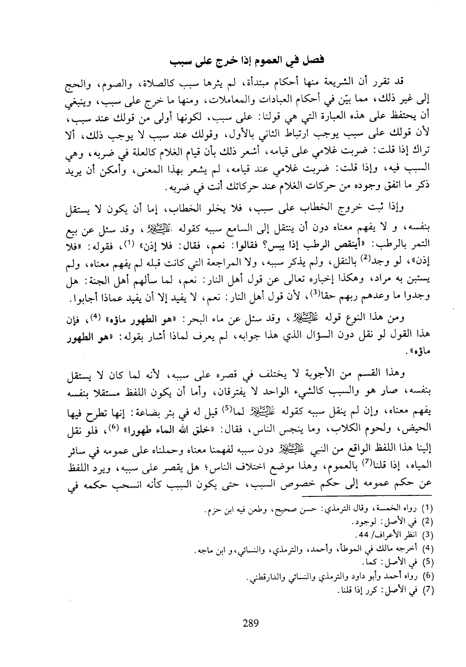 وهذا القسم من الأجوبة لا يختلف في قصره على سببه، لأنه لما كان لا يستقل بنفسه، صار هو السبب كالشيء الواحد لا يفترقان، وأما أن يكون اللفظ مستقلا بنفسه يفهم معناه، وإن لم ينقل سبه كقوله عليه السلام لما قيل له في بئر بضاعة: إنها تطرح فيها الحيض، ولحوم الكلاب، وما ينجس الناس، فقال: "خلق الله الماء طهورا"، فلو نقل إلينا هذا اللفظ الواقع من النبي عليه السلام دون سببه لفهمنا معناه وحملناه على عمومه في سائر المياه، إذا قلنا بالعموم، وهذا موضع اختلاف الناس؛ هل يقصر على سببه، ويرد اللفظ عن حكم عمومه إلى حكم خصوص السبب، حتى يكون السبب كأنه انسحب حكمه في