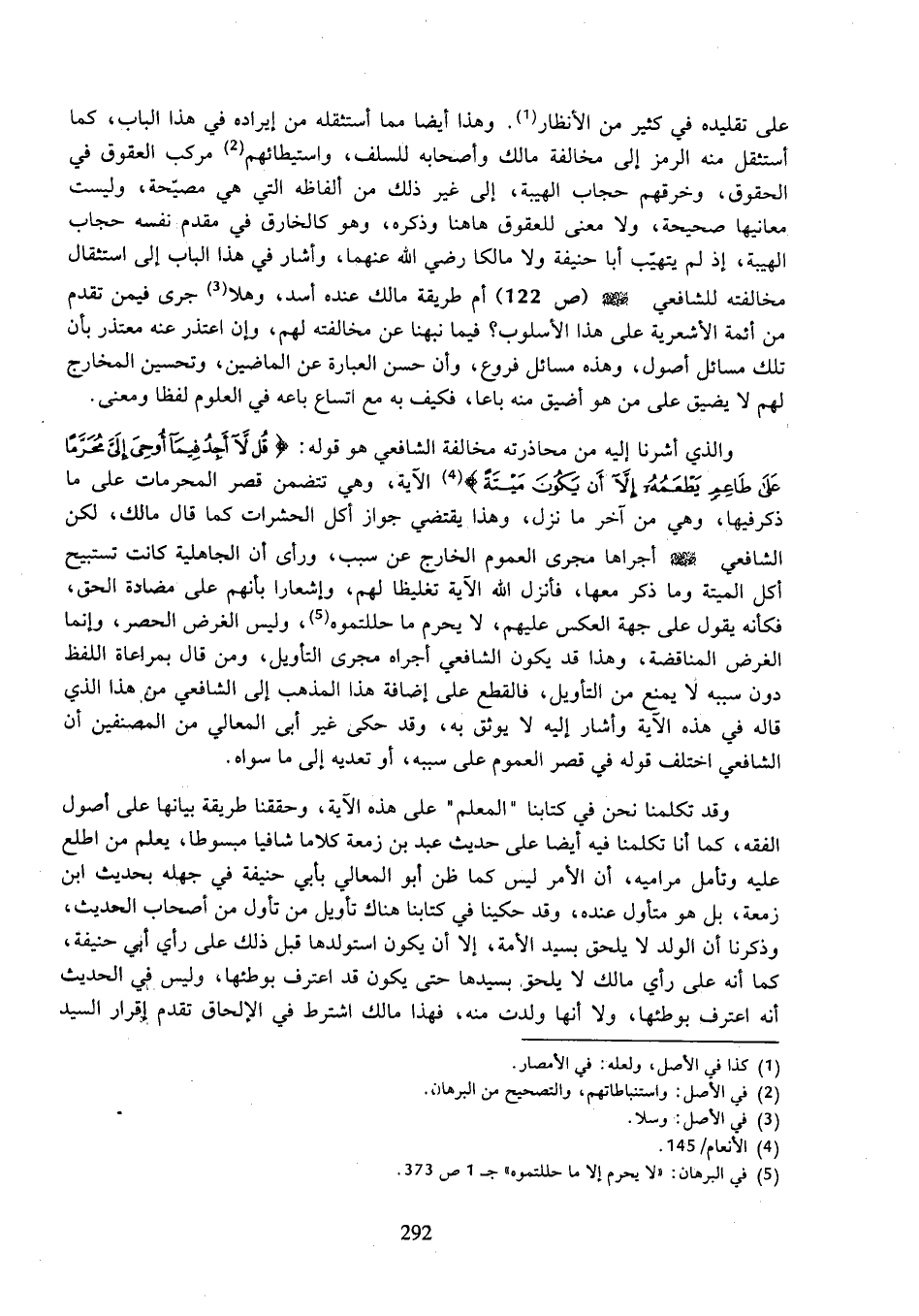 والذي أشرنا إليه من محاذرته مخالفة الشافعي هو قوله: (قل لا أجد فيما أوحى إلى محرما على طاعم يطعمه إلا أن يكون ميتة) الآية، وهي تتضمن قصر المحرمات على ما ذكر فيها، وهي من آخر ما نزل، وهذا يقضتي جواز أ: ل الحشرات كما قال مالك، لكن الشافعي رضي الله عنه أجراها مجرى العموم الخارج عن سبب، ورأى أن الجاهلية كانت تستبيح أكل الميتة وما ذكر معها، فأنزل الله الآية تغليظا لهم، وإشعارا بأنهم على مضادة الحق، فكأنه يقول على جهة العكس عليهم، لا يحرم ما حللتموه، وليس الغرض الحصر، وإنما الغرض المناقضة، وهذا قد يكون الشافعي أجراه مجرى التأويل، ومن قال بمراعاة اللفظ دون سببه لا يمنع من التأويل، فالقطع على إضافة هذا المذهب إلى الشافعي من هذا الذي قاله في هذه الآية وأشار إليه لا يوثق به، وقد حكى غير أبى المعالي من المصنفين أن الشافعي اختلف قوله في قصر العموم على سببه، أو تعديه إلى ما سواه.