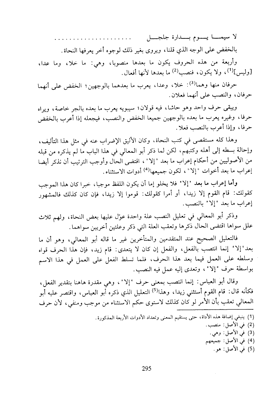 وهذا كله مستقصى في كتب النحاة، وكان الأليق الإضراب عنه في مثل هذا التأليف، وإحالة بسطه إلى أهله وكتبهم، لكن لماذكر أبو المعالي في هذا الباب ما لم يذكره من قبله من الأصوليين من أحكام إعراب ما بعد "إلا"، اقتضى الحال وأوجب الترتيب أن نذكر أيضا إعراب ما بعد أخوات "إلا"، لكون جميعها أدوات الاستثناء.