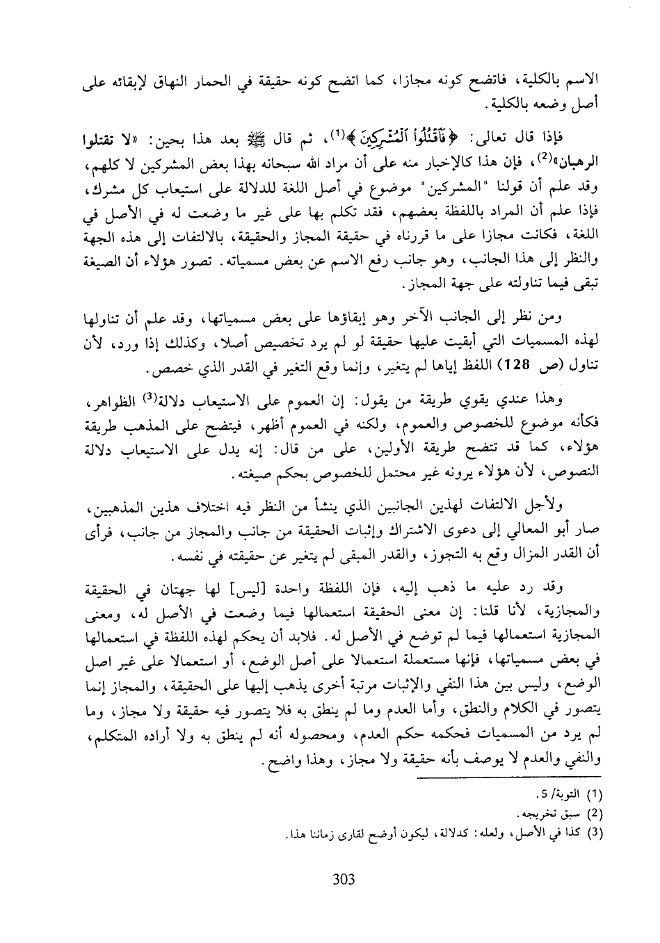 فإذا قال تعالى: (فاقتلوا المشركين)، ثم قال صلى الله عليه وسلم بعد هذا بحين: "لا تقتلوا الرهبان"، فإن هذا كالإخبار منه على أن مراد الله سبحانه بهذا بعض المشركين لا كلهم، وقد علم أن قولنا "المشركين" موضوع في أصل اللغة للدلالة على استيعاب كل مشرك، فإذا علم ان المراد باللفظة بعضهم، فقد تكلم بها على غير ما وضعت له في الأصل في اللغة، فكانت مجازا على ما قررناه في حقيقة المجاز والحقيقة، بالالتفات إلى هذه الجهة والنظر إلى هذا الجانب، وهو جانب رفع الاسم عن بعض مسمياته. تصور هؤلاء أن الصيغة تبقى فيما تناولته على جهة المجاز.