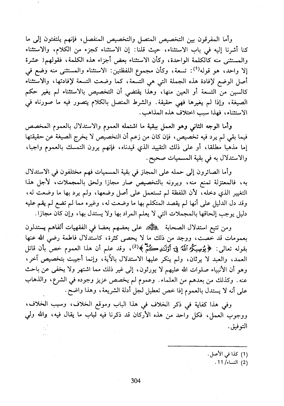 وأما المفرقون بين التخصيص المتصل والتخصيص المنفصل، فإنهم يلتفتون إلى ما كنا أشرنا إليه في باب الاستثناء، حيث قلنا: إن الاستثناء كجزء من الكلام، والاستثناء والمستثنى منه كالكلمة الواحدة، وكأن الاستثناء بعض أجزاء هذه الكلمة، فقولهم: عشرة إلا واحد، هو قوله: تسعة، وكأن مجموع اللفظتين: الاستثناء والمستثنى منه وضع في أصل الوضع لإفادة هذه الجملة التي هي التسعة، كما وضعت التسعة لإفادتها، والاستثناء كالسين من التسعة أو العين منها، وهذا يقتضي أن التخصيص بالاستثناء لم يغير حكم الصيغة، وإذا لم يغيرها فهي حقيقة. والشرط المتصل بالكلام يتصور فيه ما صورناه في الاستثناء، فهذا سبب اختلاف هذه المذاهب.