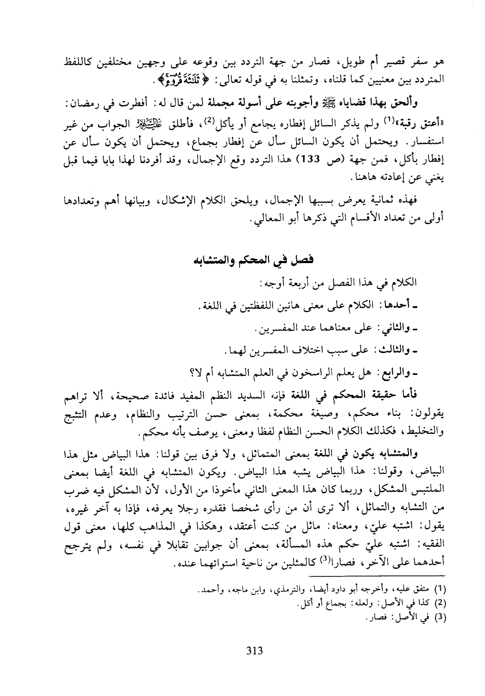 وألحق بهذا قضاياه صلى الله عليه وسلم وأجوبته على أسولة مجملة لمن قال له: أفطرت في رمضان: "أعتق رقبة" ولم يذكر السائل إفطاره يجامع أو يأكل، فأطلق عليه السلام الجواب من غير استفسار. ويحتمل أن يكون السائل سأل عن إفطار بجماع، ويحتمل أن يكون سأل عن إفطار بأكل، فمن جهة (ص ١٣٣) هذا التردد وقع الإجمال، وقد أفردنا لهذا بابا فيما قبل يغني عن إعادته هاهنا.