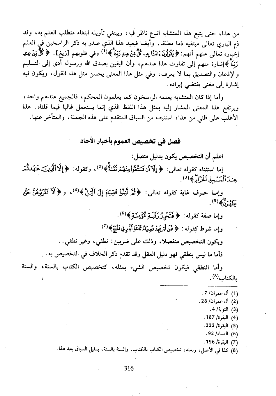 من هذا، حتى يتبع هذا المتشابه اتباع ناظر فيه، ويبتغي تأويله ابتغاء متطلب العلم به، وقد ذم الباري تعالى مبتغيه ذما مطلقا. وأيضًا فبعيد هذا الذي صدر به ذكر الراسخين في العلم إخباره تعالى عنهم أنهم: (يقولون أمنا به كل من عند ربنا) وفي قلوبهم [زيغ]. (كل من عند ربنا) إشارة منهم إلى تفاوت هذا عندهم، وأن اليقين بصدق الله ورسوله أدى إلى التسليم والإذعان والتصديق بما لا يعرف، وفي مثل هذا المعنى يحسن مثل هذا القول، ويكون فيه إشارة إلى معنى يقتضي إيراده.