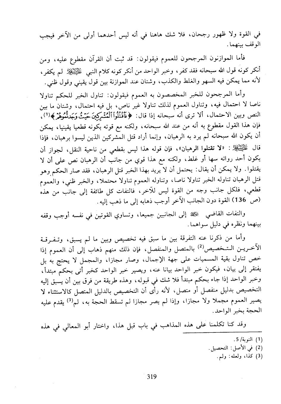 وأما المرجحون للخبر المخصصون به العموم فيقولون: تناول الخبر للحكم تناولا ناصا لا احتمال فيه، وتناول العموم لذلك تناولا غير ناص، بل فيه احتمال، وشتان ما بين النص وبين الاحتمال، ألا ترى أنه سبحانه إذا قال: (فاقتلوا المشركين حيث وجدتموهم)، فإن هذا القول مقطوع به أنه من عند الله سبحانه، ولكنه مع قوته بكونه قطعيا يقينيا، يمكن أن يكون الله سبحانه لم يرد به الرهبان، وإنما أراد قتل المشركين الذين ليسوا برهبان، فإذا قال عليه السلام: "لا تقتلوا الرهبان"، فإن قوله هذا ليس بقطعي من ناحية النقل، لجواز أن يكون أحد رواته سها أو غلط، ولكنه مع هذا قوي من جانب أن الرهبان نص على أن لا يقتلوا. ولا يمكن أن يقال: يحتمل أن لا يريد بهذا الخبر قتل الرهبان، فقد صار الحكم وهو قتل الرهبان تناوله الخبر تناولا ناصا، وتناوله العموم تناولا محتملا، والخبر ظني، والعموم قطعي، فلكل جانب وجه من القوة ليس للآخر، فالتفات كل طائفة إلى جانب من هذه (ص ١٣٦) القوة دون الجانب الآخر أوجب ذهابه إلى ما ذهب إليه.