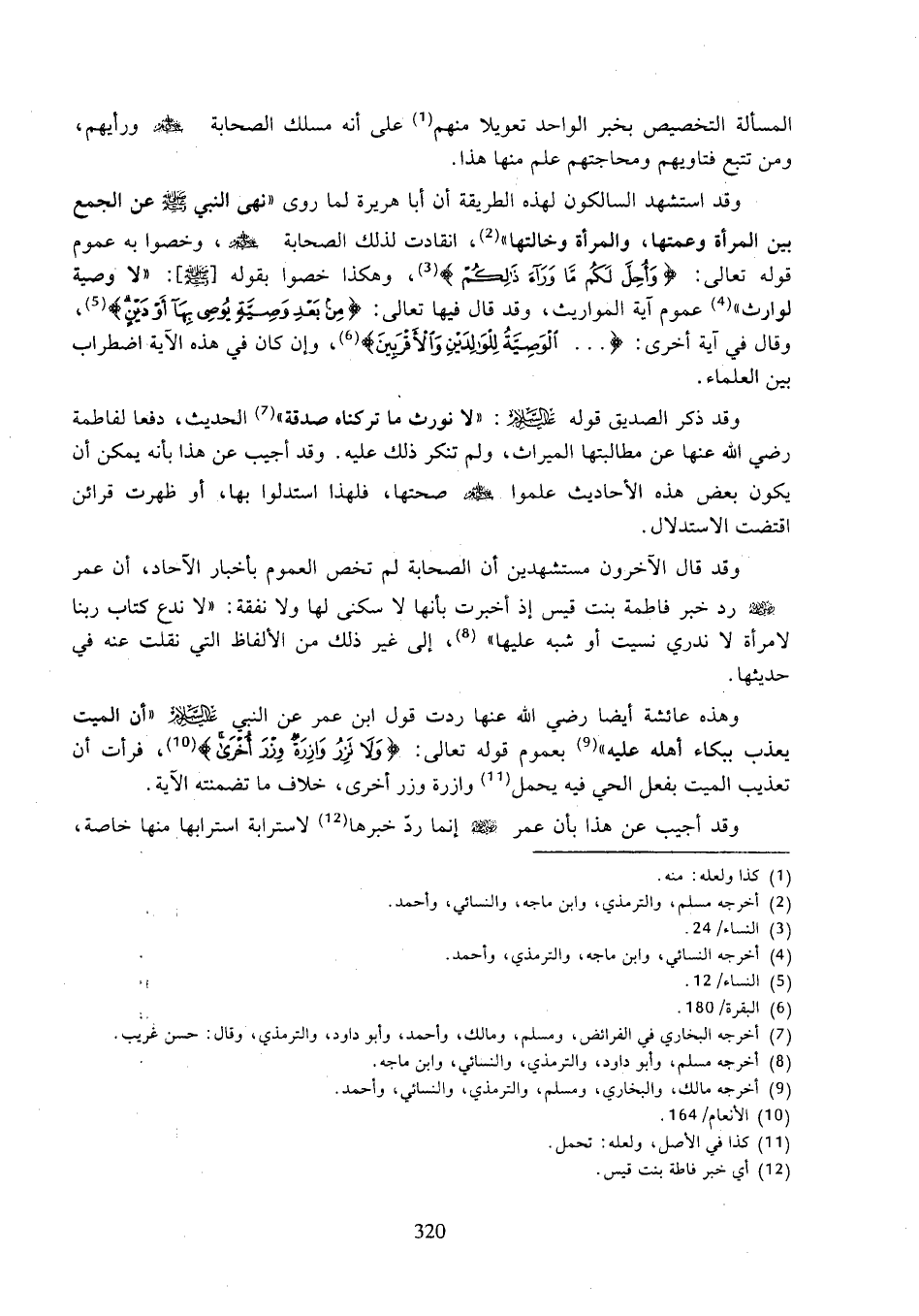 وقد استشهد السالكون لهذه الطرقة أن أبا هريرة لما روى "نهى النبي صلى الله عليه وسلم عن الجمع بين المرأة وعمتها، والمرأة وخالتها"، انقادت لذلك الصحابة رضي الله عنهم، وخصوا به عموم قوله تعالى: (وأحل لكم ما وراء ذالكم)، وهكذا خصوا بقوله [صلى الله عليه وسلم]: "لا وصية لوارث" عموم آية المواريث، وقد قال فيها تعالى: (من بعد وصية يوصى بها أو دين)، وقال في آية أخرى: (... الوصية للوالدين والأقربين)، وإن كان في هذه الآية اضطراب بين العلماء.