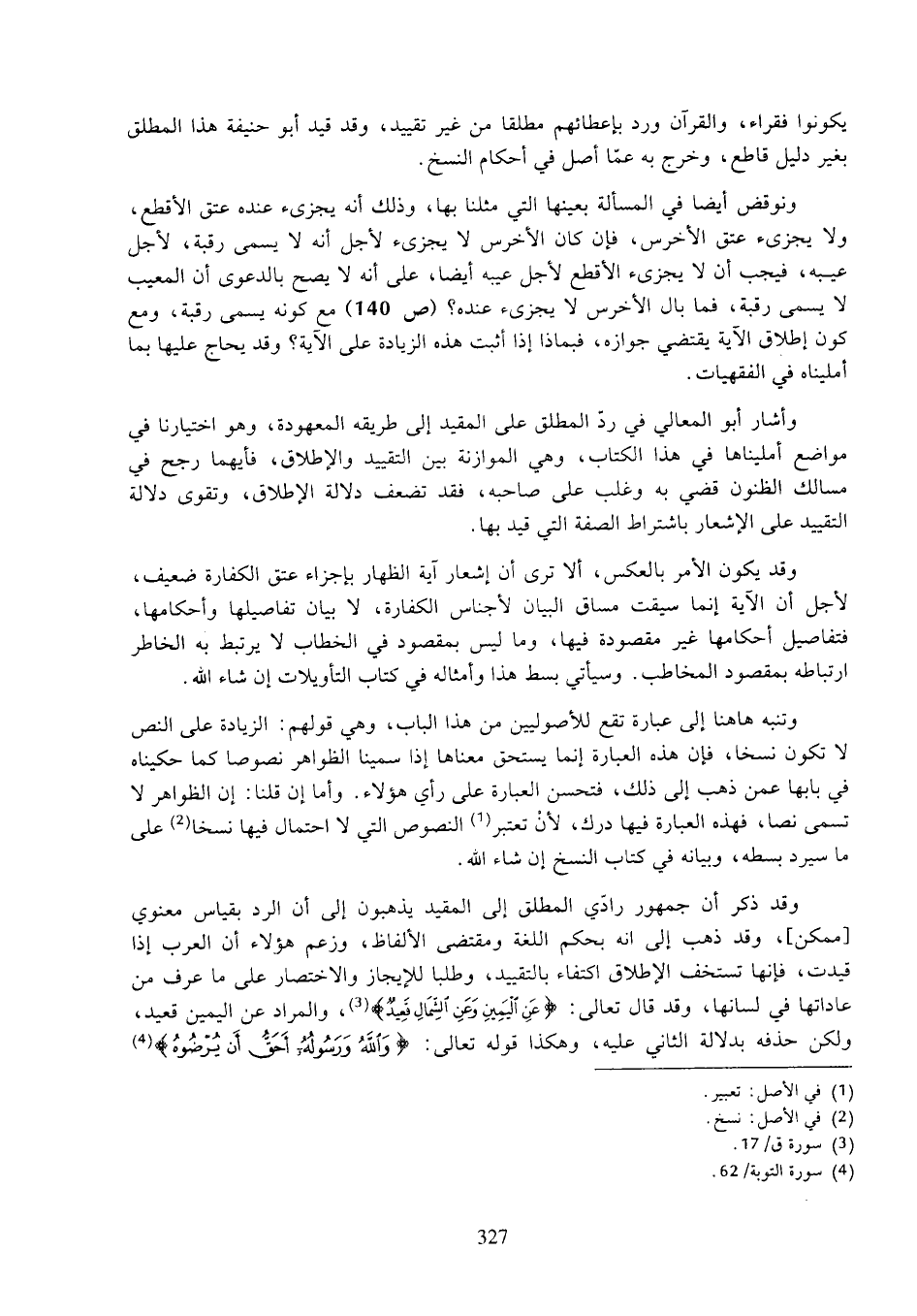 وتنبه هاهنا إلى عبارة تقع للأصوليين من هذا الباب، وهي قولهم: الزيادة على النص لا تكون نسخا، فإن هذه العبارة إنما يستحق معناها إذا سمينا الظواهر نصوصا كما حكيناه في بابها عمن ذهب إلى ذلك، فتحسن العبارة على رأي هؤلاء. وأما إن قلنا: إن الظواهر لا تسمى نصا، فهذه العبارة فيها درك، لأن تعتبر النصوص التي لا احتمال فيها نسخا على ما سيرد بسطه، وبيانه في كتاب النسخ إن شاء الله.