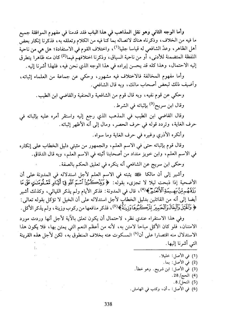 وأشير إلى أن مالكا رضي الله عنه يثبته في الاسم العلم لأجل استدلاله في الدونة على أن الأضحية إذا ذبحت ليلا لا تجزئ بقوله: (ويذكروا اسم الله في أيام معلومات على ما رزقهم من بهيمة الأنعام)، قال في المدونة: فذكر الأيام ولم يذكر الليالي، وكذلك أشير أيضا إلى أنه من القائلين بدليل الخطاب لأجل استدلاله على أن الخيل لا تؤكل بقوله تعالى: (والخيل والبغال والحمير لتركبوها وزينة)، فذكر منافعها من ركوب وزينة، ولم يذكر الأكل.