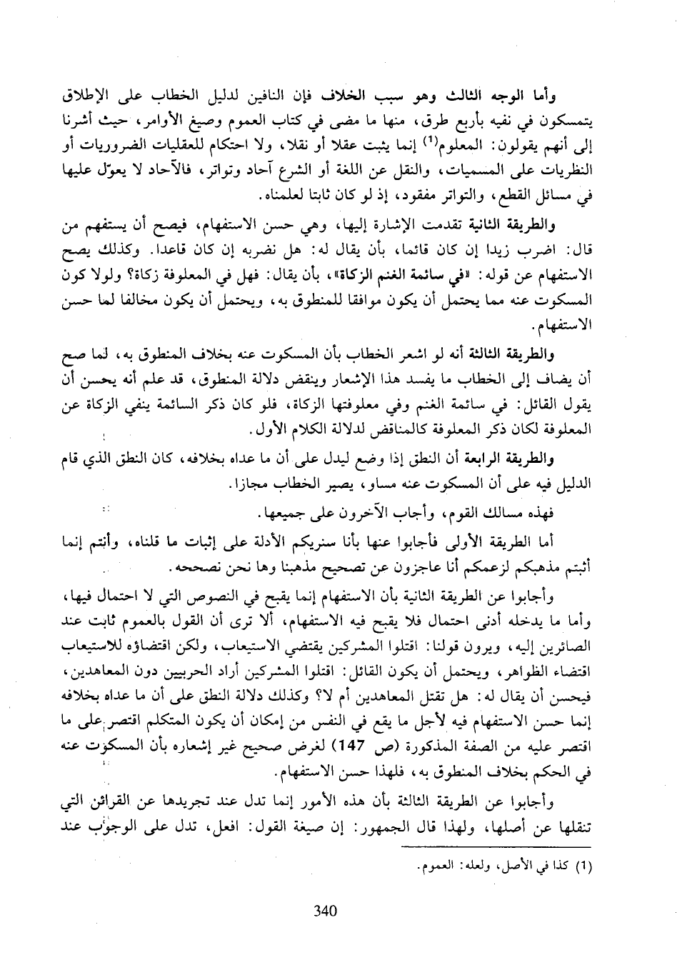 وأجابوا عن الطريقة الثانية بأن الاستفهام إنما يقبح في النصوص التي لا احتمال فيها، وأما ما يدخله أدنى احتمال فلا يقبح فيه الاستفهام، ألا ترى أن القول بالعموم ثابت عند الصائرين إليه، ويرون قولنا: اقتلوا المشركين يقتضي الاستيعاب، ولكن اقتضاؤه للاستيعاب اقتضاء الظواهر، ويحتمل أن يكون القائل: اقتلوا المشركين أراد الحربيين دون المعاهدين، فيحسن أن يقال له: هل تقتل المعاهدين أم لا؟ وكذلك دلالة النطق على أن ما عداه بخلافه إنما حسن الاستفهام فيه لأجل ما يقع في النفس من إمكان أن يكون المتكلم اقتصر على ما اقتصر عليه من الصفة المذكورة (ص ١٤٧) لغرض صحيح غير إشعاره بأن المسكوت عنه في الحكم بخلاف المنطوق به، فلهذا حسن الاستفهام.