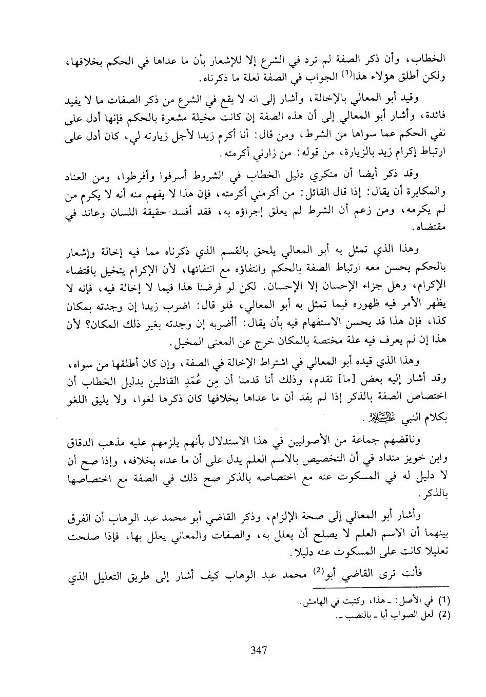 وهذا الذي قيده أبو المعالي في اشتراط الإخالة في الصفة، وإن كان أطلقها من سواه، وقد أشار إليه بعض [ما] تقدم، وذلك أنا قدمنا أن مِن عُمَدِ القائلين بدليل الخطاب أن اختصاص الصفة بالذكر إذا لم يفد أن ما عداها بخلافها كان ذكرها لغوا، ولا يليق اللغو بكلام النبي عليه السلام.
