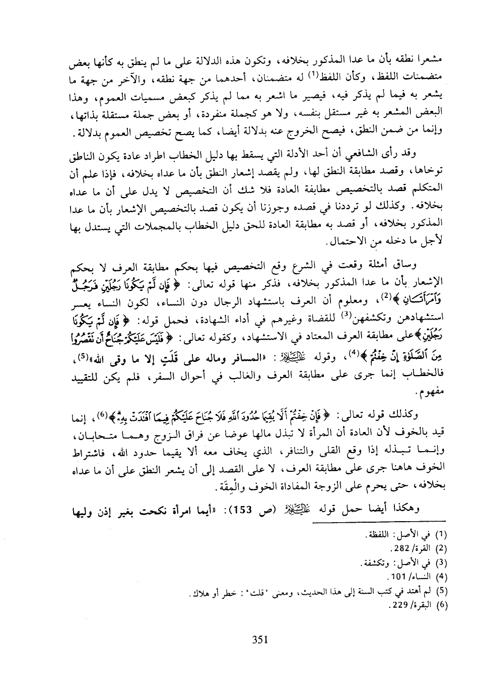 وساق أمثلة وقعت في الشرع وقع التخصيص فيها بحكم مطابقة العرف لا بحكم الإشعار بأن ما عدا المذكور بخلافه، فذكر منها قوله تعالى: (فإن لم يكونا رجلين فرجل وامرأتان)، ومعلوم أن العرف باستشهاد الرجال دون النساء، لكون النساء يعسر استشهادهن وتكشفهن للقضاة وغيرهم في أداء الشهادة، فحمل قوله: (فإن لم يكونا رجلين) على مطابقة العرف المعتاد في الاستشهاد، وكقوله تعالى: (فليس عليكم جناح أن تقصروا من الصلاة إن خفتم)، وقوله عليه السلام: (المسافر وماله على قلت إلا ما وقى الله"، فالخطاب إنما جرى على مطابقة العرف والغالب في أحوال السفر، فلم يكن للتقييد مفهوم.