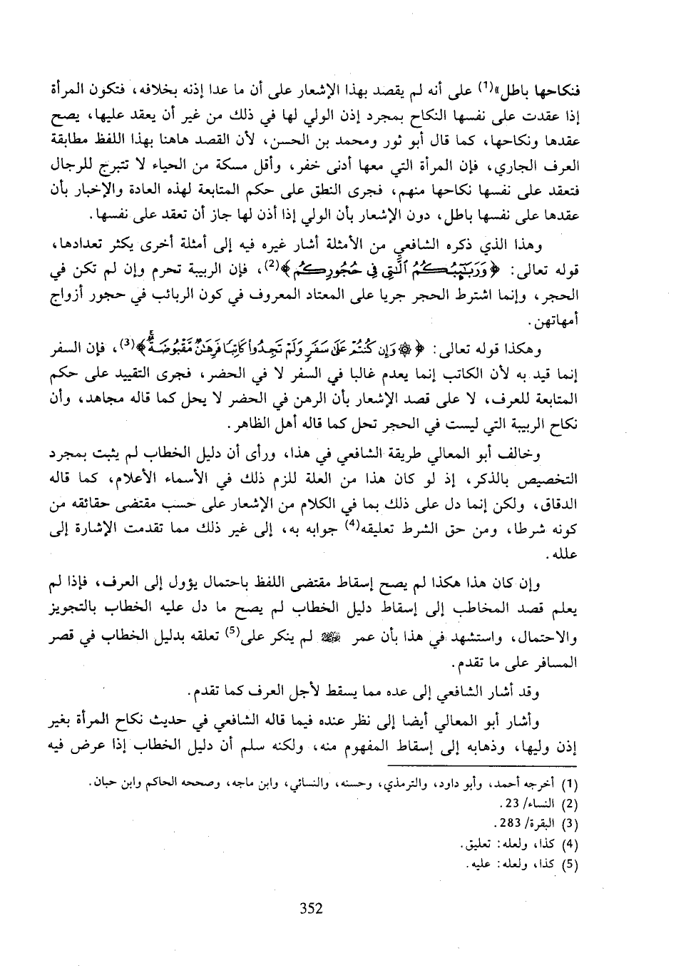وأشار أبو المعالي أيضا إلى نظر عنده فيما قاله الشافعي في حديث نكاح المرأة بغير إذن وليها، وذهابه إلى إسقاط المفهوم منه، ولكنه سلم أن دليل الخطاب إذا عرض فيه