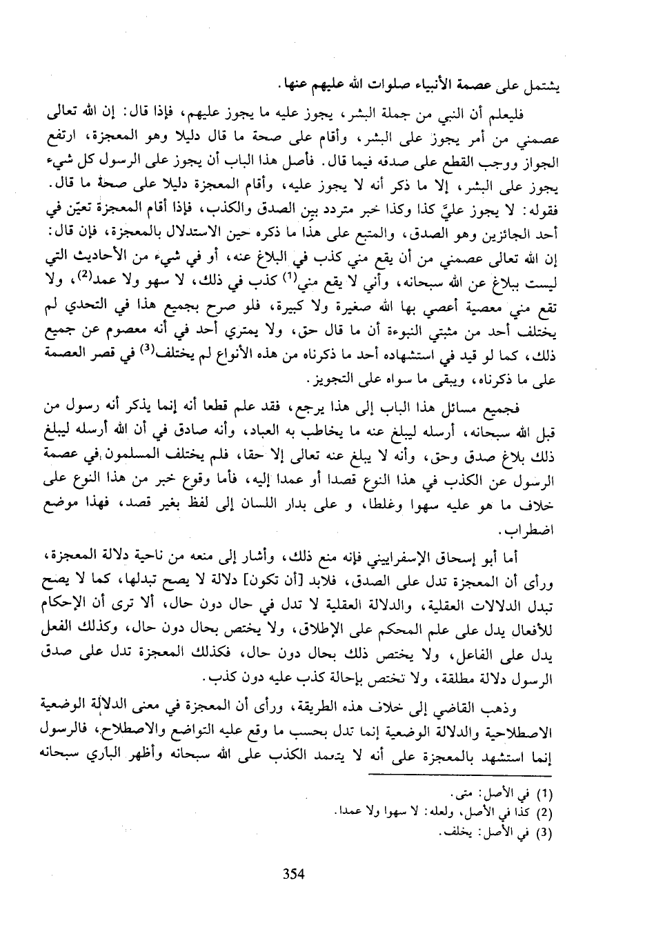 فليعلم أن النبي من جملة البشر، يجوز عليه ما يجوز عليهم، فإذا قال: إن الله تعالى عصمني من أمر يجوز على البشر، وأقام على صحة ما قال دليلا وهو المعجزة، ارتفع الجواز ووجب القطع على صدقة فيما قال. فأصل هذا الباب أن يجوز على الرسول كل شيء يجوز على البشر، إلا ما ذكر أن لا يجوز عليه، وأقام المعجزة دليلا على صحة ما قال. فقوله: لا يجوز عليَّ كذا وكذا خبر متردد بين الصدق والكذب، فإذا أقام المعجزة تعين في أحد الجائزين وهو الصدق، والمتبع على هذا ما ذكره حين الاستدلال بالمعجزة، فإن قال: إن الله تعالى عصمني أن يقع مني كذب في البلاغ عنه، أو في شيء من الأحاديث التي ليست ببلاغ عن الله سبحانه، وأني لا يقع مني كذب في ذلك، لا سهو ولا عمد، ولا تقع مني معصية أعصي بها الله صغيرة ولا كبيرة، فلو صرح بجميع هذا في التحدي لم يختلف أحد من مثبتي النبوءة أن ما قال حق، ولا يمتري أحد في أنه معصوم عن جميع ذلك، كما لو قيد في استشهاده أحد ما ذكرناه من هذه الأنواع لم يختلف في قصر العصمة على ما ذكرناه، ويبقى ما سواه على التجويز. فجميع مسائل هذا الباب إلى هذا يرجع، فقد علم قطعا أنه إنما يذكر أنه رسول من قبل الله سبحانه، أرسله ليبلغ عنه ما يخاطب به العباد، وأنه صادق في أن الله أرسله ليبلغ ذلك بلاغ صدق وحق، وأنه لا يبلغ عنه تعالى إلا حقا، فلم يختلف المسلمون في عصمة الرسول عن الكذب في هذا النوع قصدا أو عمدا إليه، فأما وقوع خبر من هذا النوع على خلاف ما هو عليه سهوا وغلطا، وعلى بدار اللسان إلى لفظ بغير قصد، فهذا موضع اضطراب.