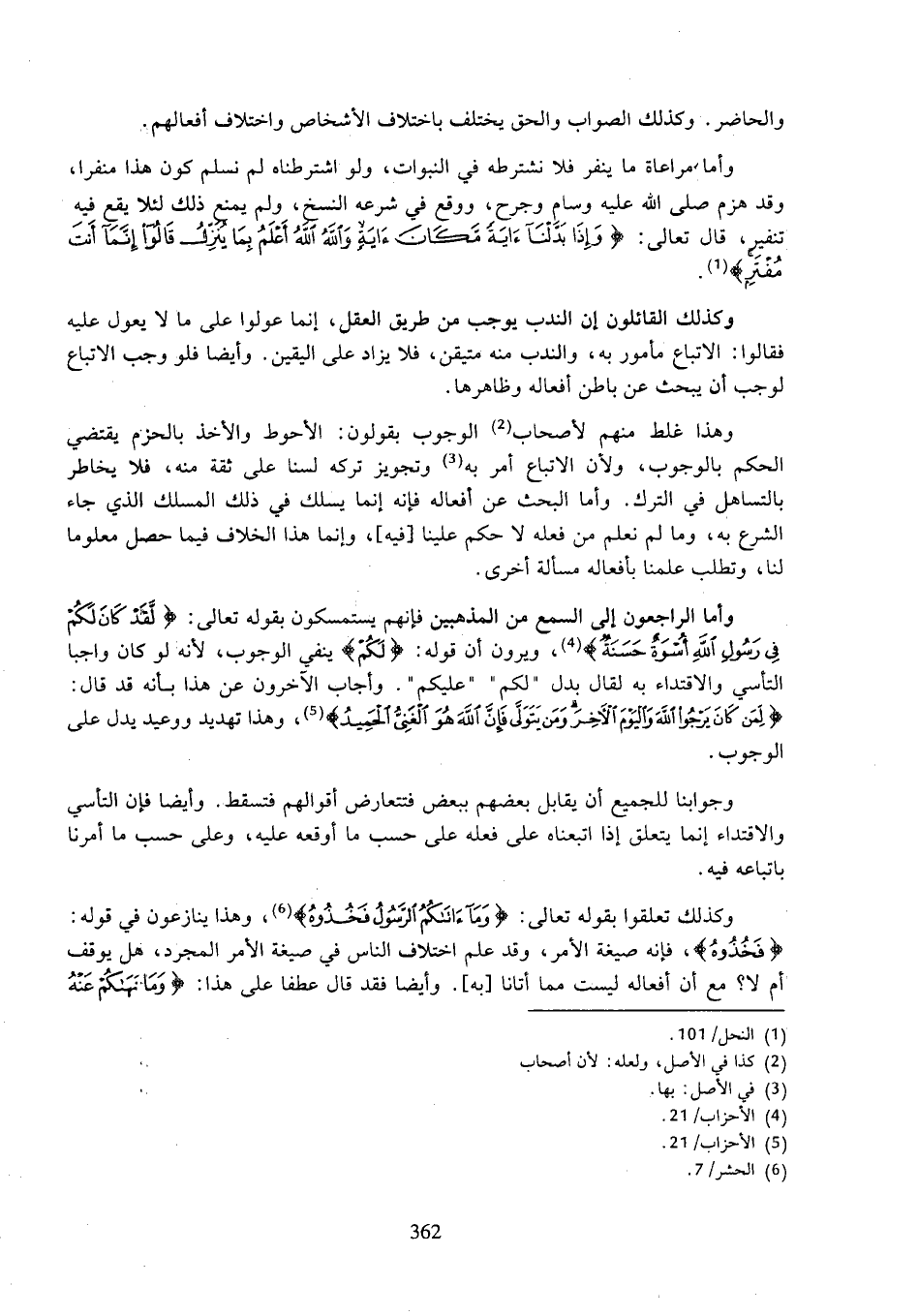 وأما الراجعون إلى السمع من المذهبين فإنهم يستمسكون بقوله تعالى: (لقد كان لكم في رسول الله أسوة حسنة)، ويرون أن قوله: (لكم) ينفي الوجوب، لأنه لو كان واجبا التأسي والاقتداء به لقال بدل "لكم" "عليكم". وأجاب الآخرون عن هذا بأنه قد قال: "لمن كان يرجوا الله واليوم الآخر ومن يتولى فإن الله هو الغني الحميد)، وهذا تهديد ووعيد يدل على الوجوب.