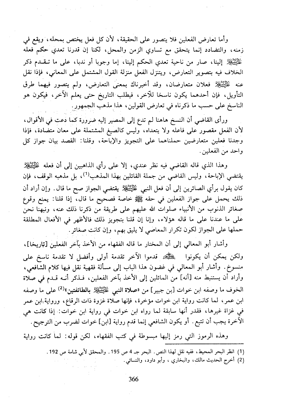 وأشار أبو المعالي إلى أن المختار ما قاله الفقهاء من الأخذ بآخر الفعلين [تاريخا]، ولكن يمكن أن يكونوا رضي الله عنهم قدموا الآخر تقدمة أولى وأفضل لا تقدمة ناسخ على منسوخ. وأشار أبو المعالي في غضون هذا الباب إلى مسألة فقهية نقل فيها كلام الشافعي، وأراد أن يستنبط منه [أنه] من المائلين إلى الأخذ بآخر الفعلين، فذكر أنه قدم في صلاة الخوف ما وصفه ابن خوات [بن جبير] من "صلاة النبي عليه السلام بالطائفتين" على ما وصفه ابن عمر، لما كانت رواية ابن خوات مؤخرة، فإنها صلاة غزوة ذات الرقاع، ورواية ابن عمر في غزاة غيرها، فقدر أنها سابقة لما رواه ابن خوات في رواية ابن خوات: إذا كانت هي الآخرة يجب أن تتبع. أو يكون الشافعي إنما قدم رواية [ابن] خوات لضرب من الترجيح.