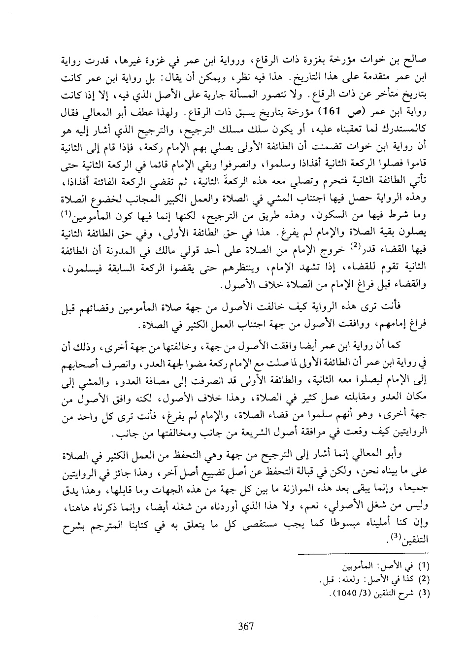 صالح بن خوات مؤرخة ذات الرقاع، ورواية ابن عمر في غزوة غيرها، قدرت رواية ابن عمر متقدمة على هذا التاريخ. هذا فيه نظر، ويمكن أن يقال: بل رواية ابن عمر كانت رواية ابن عمر (ص ١٦١) مؤرخة بتاريخ يسبق ذات الرقاع. ولهذا عطف أبو المعالي فقال كالمستدرك لما تعقبناه عليه، أو يكون سلك مسلك الترجيح، والترجيح الذي أشار إليه هو أن رواية ابن خوات تضمنت أن الطائفة الأولى يصلي بهم الإمام ركعة، فإذا قام إلى الثانية قاموا فصلوا الركعة الثانية أفذاذا وسلموا، وانصرفوا وبقى الإمام قائما في الركعة الثانية حتى تأتي الطائفة الثانية فتحرم وتصلي معه هذه الركعة الثانية، ثم تقضي الركعة الفائتة أفذاذا، وهذه الرواية حصل فيها اجتناب المشي في الصلاة والعمل الكبيرة المجانب لخضوع الصلاة وما شرط فيها من السكون، وهذه طريق من الترجيح، لكنها إنما فيها كون المأمومين يصلون بقية الصلاة والإمام لم يفرغ. هذا في حق الطائفة الأولى، وفي حق الطائفة الثانية فيها القضاء قدر خروج الإمام من الصلاة على أحد قولي مالك في المدونة أن الطائفة الثانية تقوم للقضاء، إذا تشهد الإمام، وينتظرهم حتى يقضوا الركعة السابقة فيسلمون، والقضاء قبل فراغ الإمام من الصلاة خلاف الأصول.