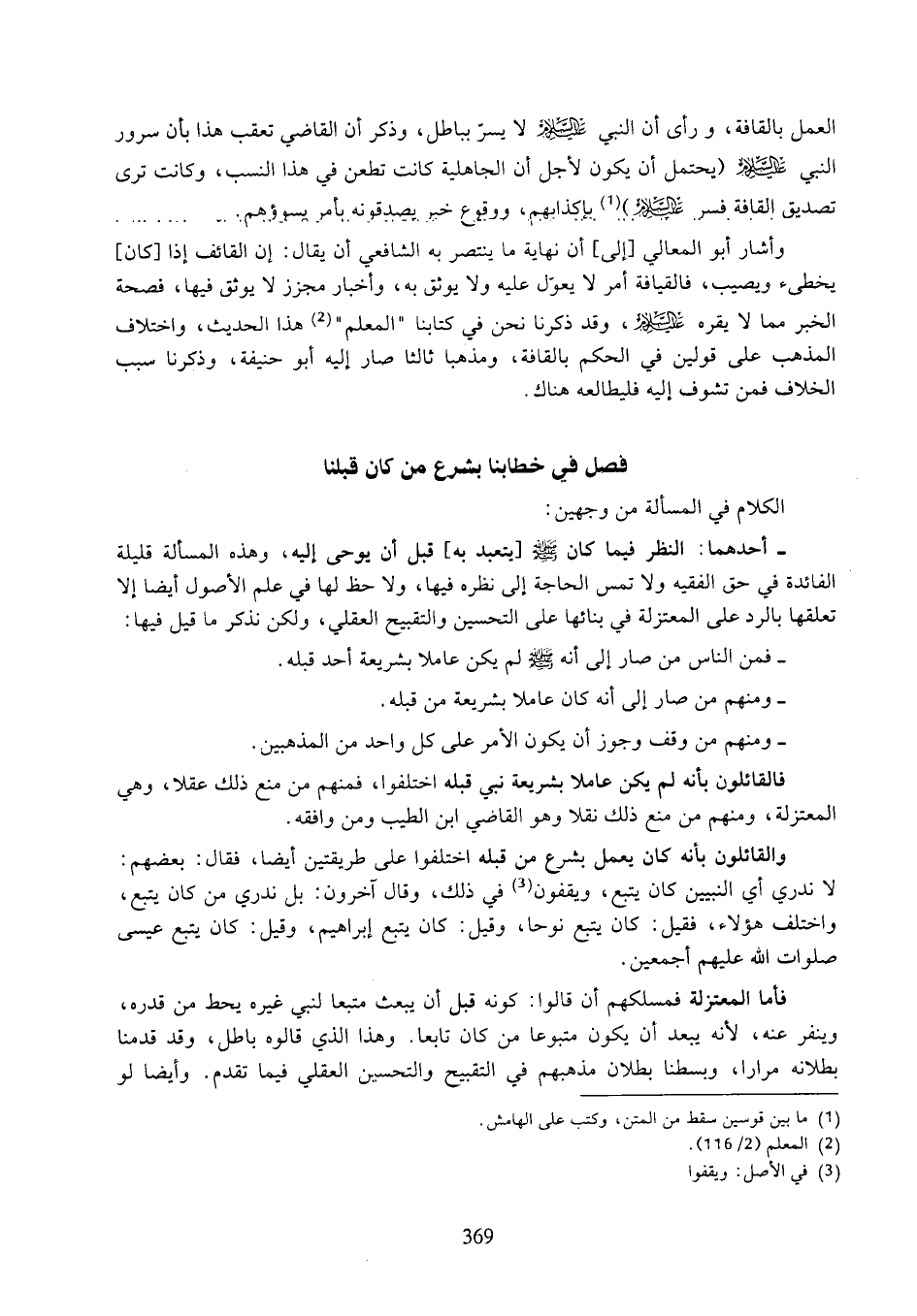 فأما المعتزلة فمسلكهم أن قالوا: كونه قبل أن يبعث متبعا لنبي غيره يحط من قدره، وينفر عنه، لأنه يبعد أن يكون متبوعا من كان تابعا. وهذا الذي قالوه باطل، وقد قدمنا بطلان مرارا، وبسطنا بطلان مذهبهم في التقبيح والتحسين العقلي فيما تقدم. وأيضا لو