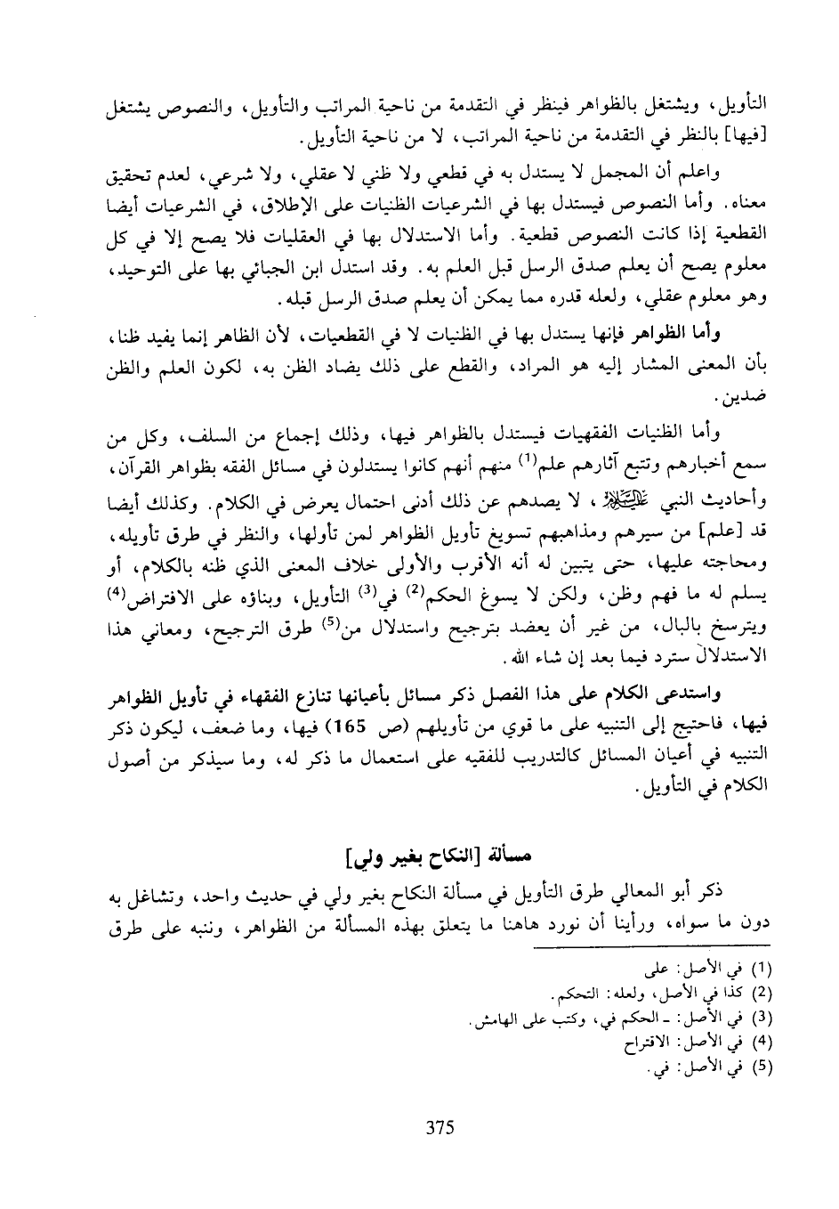واستدعى الكلام على هذا الفصل ذكر مسائل بأعيانها تنازع الفقهاء في تأويل الظواهر فيها، فاحتيج إلى التنبيه على ما قوي من تأويلهم (ص ١٦٥) فيها، وما ضعف، ليكون ذكر التنبيه في أعيان المسائل كالتدريب للفقيه على استعمال ما ذكر له، وما سيذكر من أصول الكلام في التأويل.