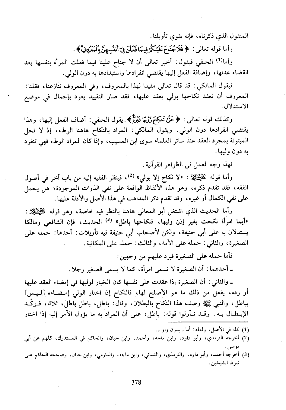 وأما الحديث الذي اشتغل أبو المعالي هاهنا بالنظر فيه خاصة، وهو قوله عليه السلام: "أيما امرأة نكحت بغير إذن وليها، فنكاحها باطل" الحديث، فإن الشافعي ومالكا يستدلان به على أبي حنيفة، ولكن لأصحاب أبي حنيفة فيه تأويلات: أحدها: حمله على الصغيرة: والثاني: حمله على الأمة، والثالث: حمله على المكاتبة.