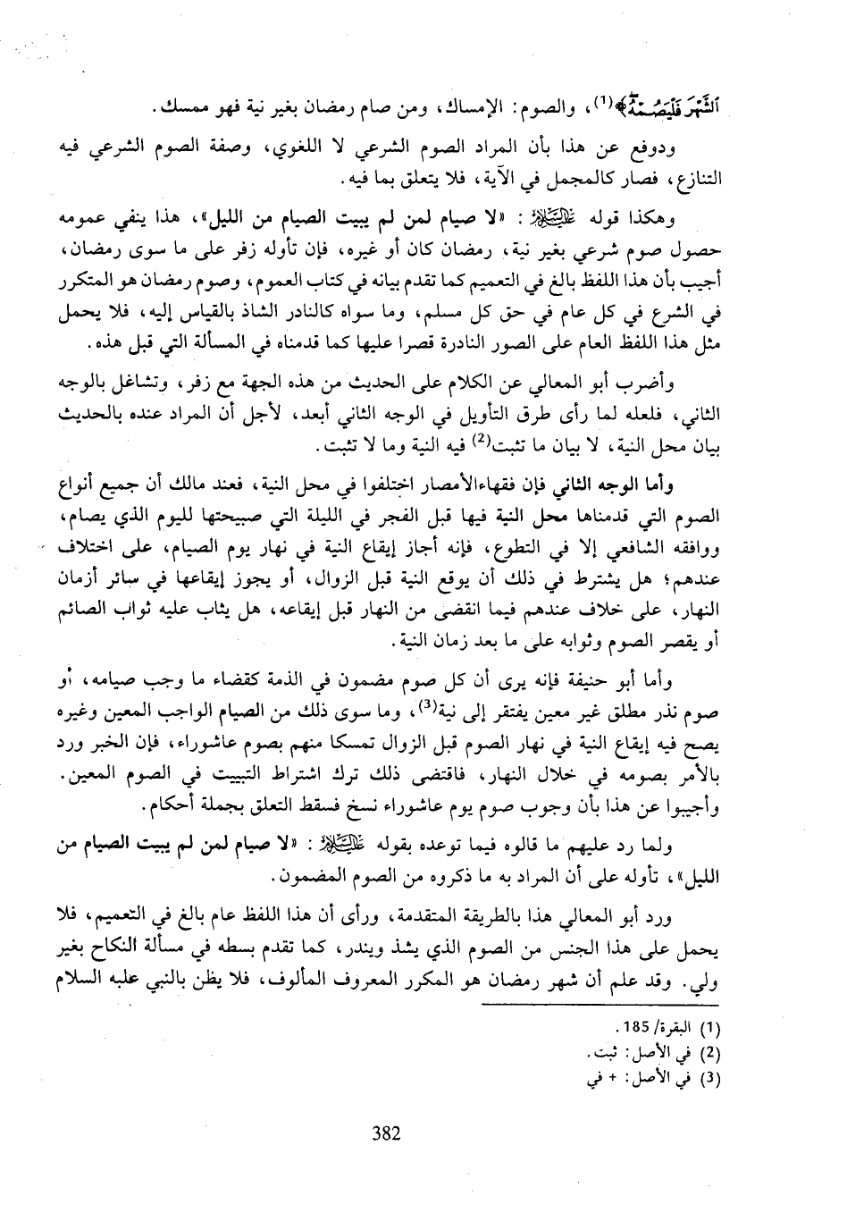 ورد أبو المعالي هذا بالطريقة المتقدمة، ورأى أن هذا اللفظ عام بالغ في التعميم، فلا يحمل على هذا الجنس من الصوم الذي يشذ ويندر، كما تقدم بسطه في مسألة النكاح بغير ولي. وقد علم أن شهر رمضان هو المكرر المعروف المألوف، فلا يظن بالنبي عليه السلام