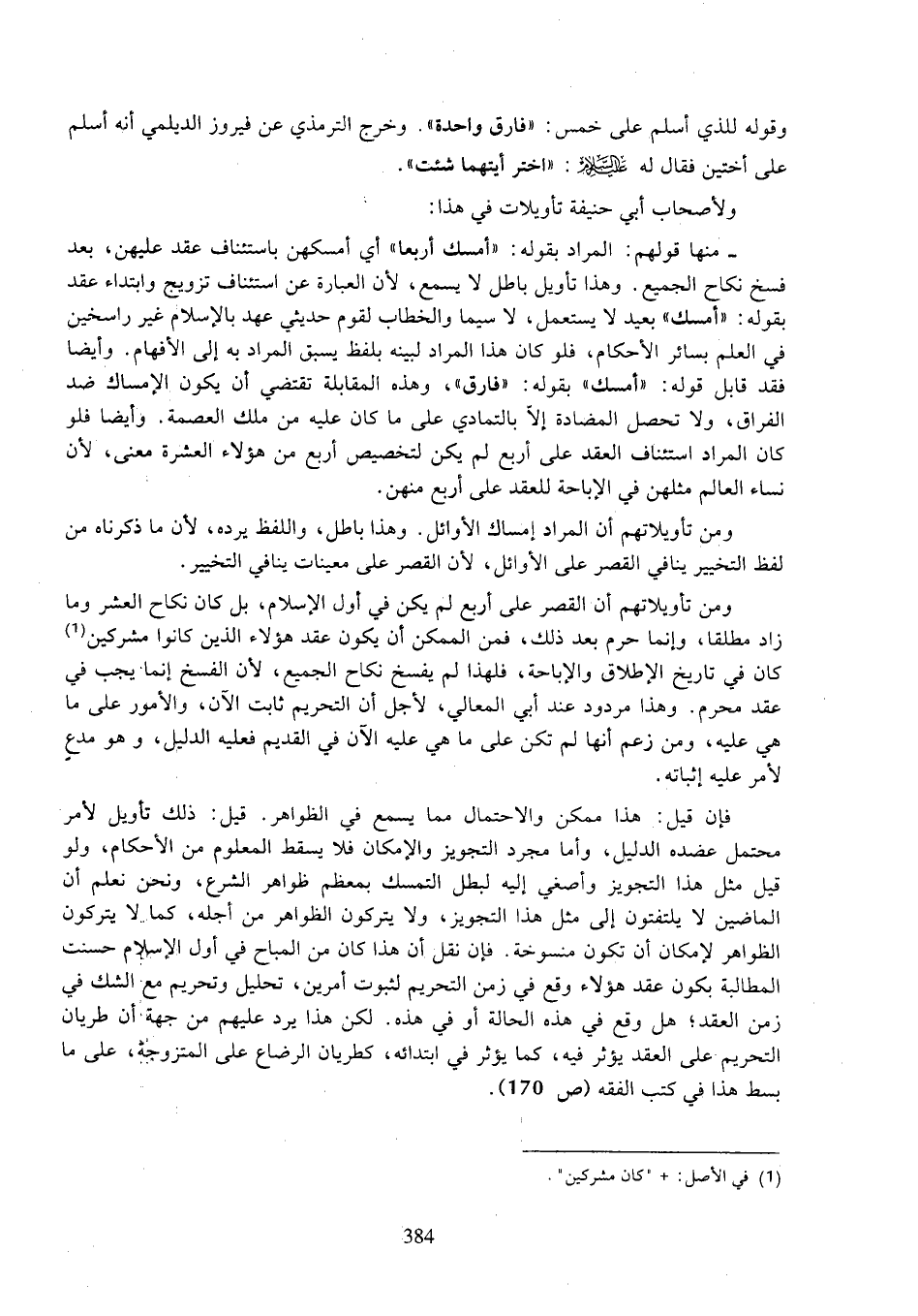 ومن تأويلاتهم أن القصر على أربع لم يكن في أول الإسلام، بل كان نكاح العشر وما زاد مطلقا، وإنما حرم بعد ذلك، فمن الممكن أن يكون عقد هؤلاء الذين كانوا مشركين كان في تاريخ الإطلاق والإباحة، فلهذا لم يفسخ نكاح الجميع، لأن الفسخ إنما يجب في عقد محرم. وهذا مردود عند أبي المعالي، لأجل أن التحريم ثابت الآن، والأمور على ما هي عليه، ومن زعم أنها لم تكن على ما هي عليه الآن في القديم فعليه الدليل، وهو مدع لأمر عليه إثباته.
