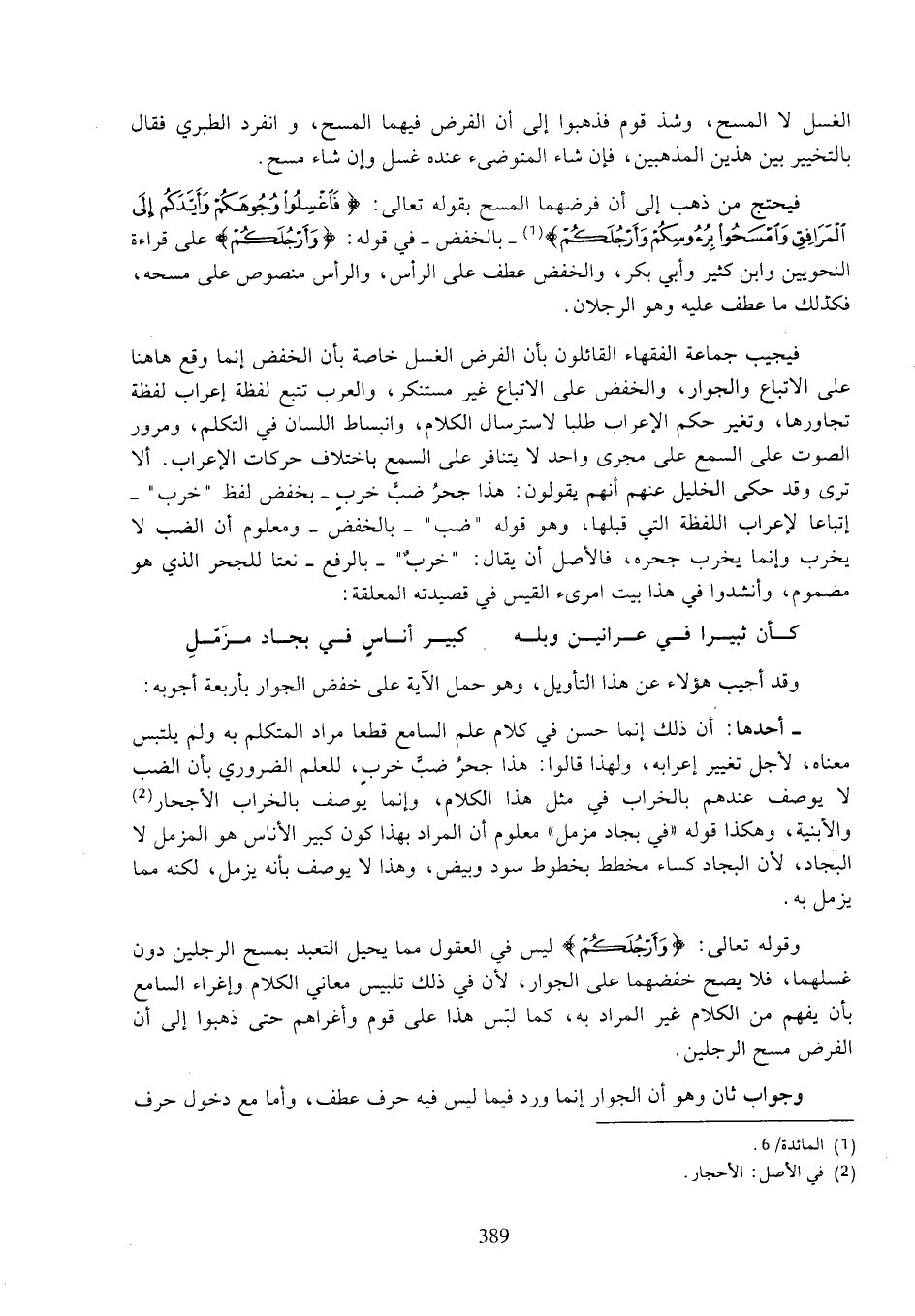 وقوله تعالى: (وأرجلكم) ليس في العقول مما يحيل التعبد بمسح الرجلين دون غسلهما، فلا يصح خفضهما على الجار، لأن في ذلك تلبيس معاني الكلام وإغراء السامع بأن يفهم من الكلام غير المراد به، كما لبس هذا على قوم وأغراهم حتى ذهبوا إلى أن الفرض مسح الرجلين.