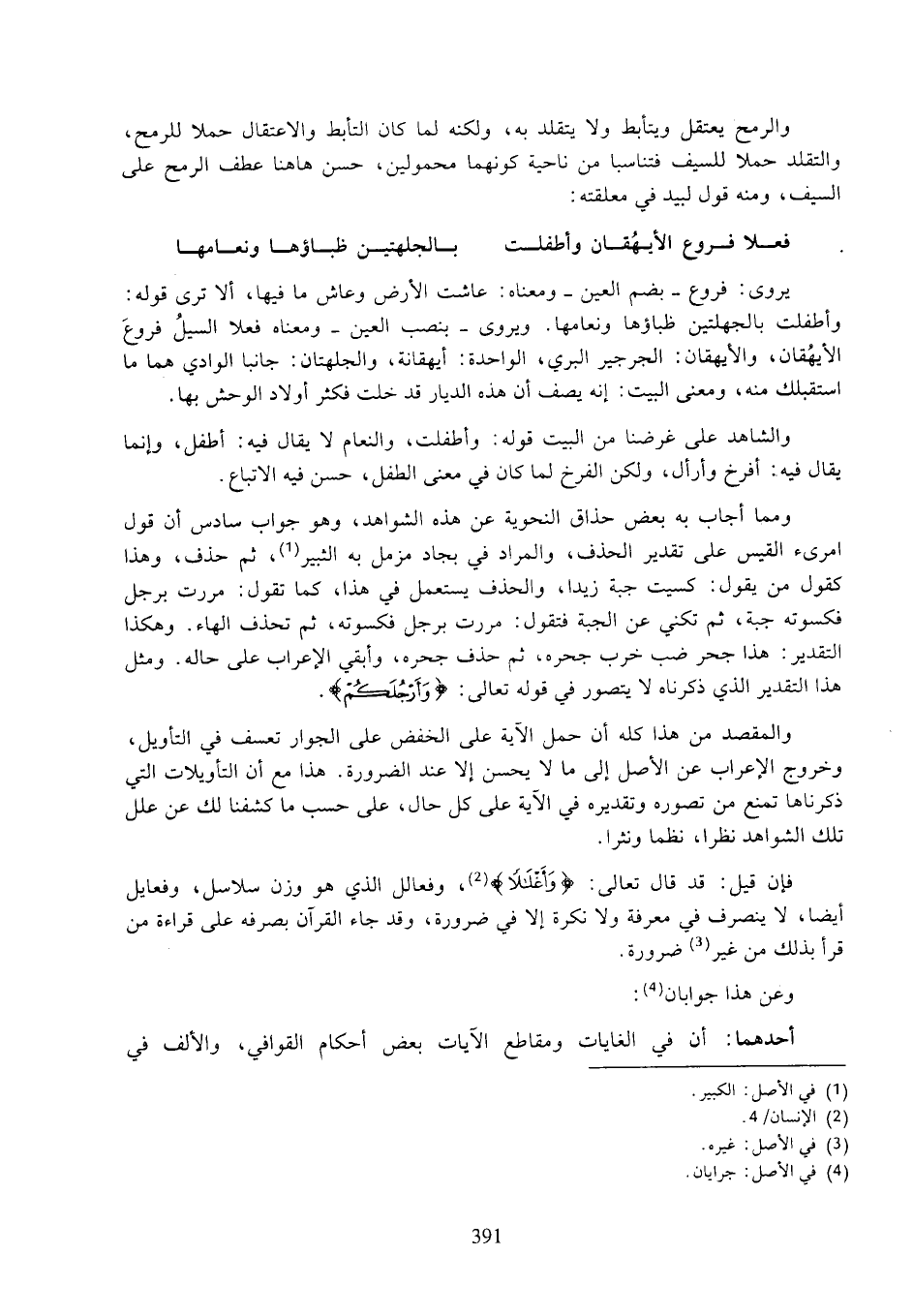 والمقصد من هذا كله أن حمل الآية على الخفض على الجوار تعسف في التأويل، وخروج الإعراب عن الأصل إلى ما لا يحسن إلا عند الضرورة. هذا مع أن التأويلات التي ذكرناها تمنع من تصوره وتقديره في الآية على كل حال، على حسب ما كشفنا لك عن علل تلك الشواهد نظرا، نظما ونثرا.