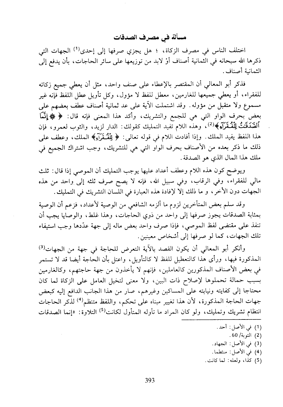 وأنكر أبو المعالي أن يكون القصد بالآية التعرض للحاجة في جهة من الجهات المذكورة فيها، ورأى هذا كالتعطيل للفظ لا كالتأويل، واعتل بأن الحاجة أيضا قد لا تستمر في بعض الأصناف المذكورين كالعاملين، فإنهم لا يأخذون من جهة حاجتهم، وكالغارمين بسبب حمالة تحملوها لإصلاح ذات البين، ولا معنى لتخيل العامل على الزكاة لما كان محتاجا إلى كفايته ونيابته على المساكين وغيرهم، صار من هذا الجانب الدافع إليه كبعض جهات الحاجة المذكورة، لأن هذا تغيير مبناه على تحكم، واللفظ منتظم لذكر الحاجات انتظام تشريك وتمليك، ولو كان المراد تأوله المتأول لكانت التلاوة: "إنما الصدقات