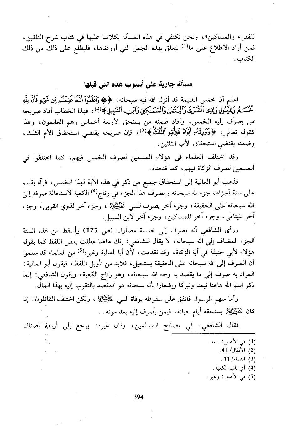 ورأى الشافعي أنه يصرف إلى خمسة مصارف (ص ١٧٥) وأسقط من هذه الستة الجزء المضاف إلى الله سبحانه، لا يقال للشافعي: إنك هاهنا عطلت بعض اللفظ كما يقوله هؤللاء لأبي حنيفة في آية الزكاة، وقد تقدمت، لأن أبا العالية وغيره من العلماء قد سلموا أن الصرف إلى الله سبحانه على الحقيقة يستحيل، فلابد من تأويل اللفظ، فيقول أبو العالية: المراد به صرف إلى ما يقصد به وجه الله سبحانه، وهو رتاج الكعبة، ويول الشافعي: إنما ذكر اسم الله هاهنا تيمنا وتبركا وإشعارا بأنه سحبانه هو المقصد بالتقرب إليه بهذا المال.